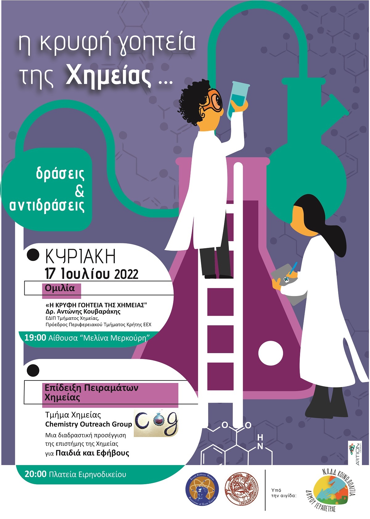 Ο Δρ Αντώνης Κουβαράκη θα μιλήσει στην αίθουσα Μελίνα Μερκούρη στις 19.00 για την « Κρυφή Γοητεία της Χημείας» και λίγο αργότερα στις 20.00 στην πλατεία Ειρηνοδικείου δίπλα στο κτίριο της Αστυνομίας θα γίνει μια διαδραστική προσέγγιση της επιστήμης της Χημείας για παιδιά και εφήβους.