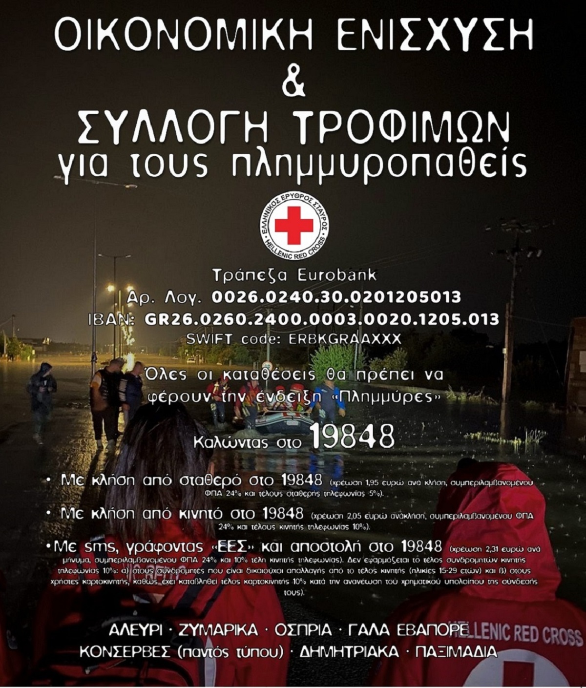 Σε συνέχεια της μεγάλης κινητοποίησης του Ελληνικού Ερυθρού Σταυρού για τις εκτεταμένες καταστροφές που προκάλεσαν οι καταστροφικές πλημμύρες σε Καρδίτσα, Λάρισα, Βόλο και Τρίκαλα, ο Ε.Ε.Σ. αναπτύσσει επιπλέον κινήσεις συμπαράστασης των ανθρώπων που χρήζουν βοήθειας. Συγκεκριμένα, απευθύνει κάλεσμα προς ενίσχυση των πληγέντων, με στόχο να συγκεντρωθεί όσο το δυνατό μεγαλύτερο ποσό.