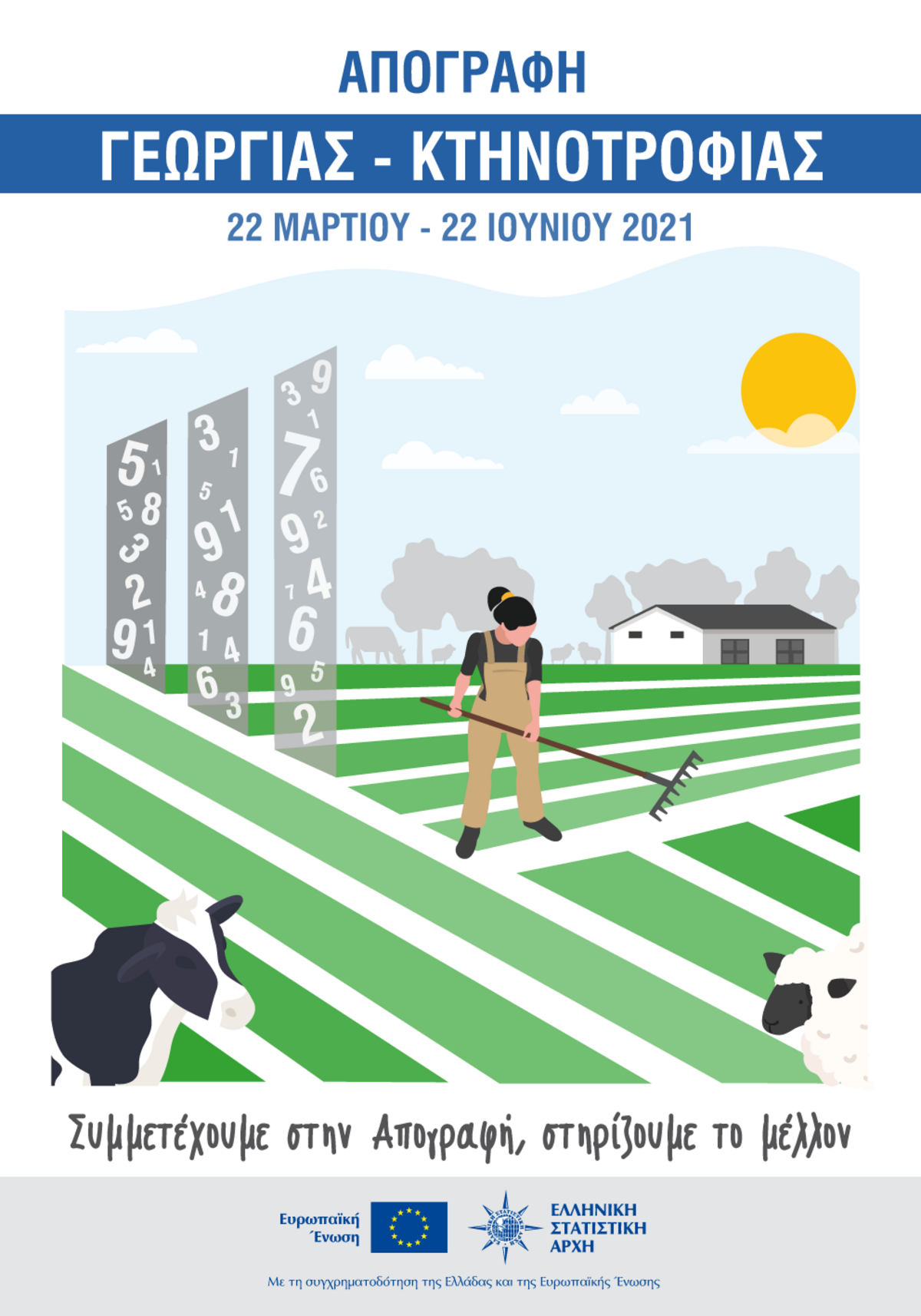Η Ελληνική Στατιστική Αρχή (ΕΛΣΤΑΤ) ανακοινώνει την έναρξη της Απογραφής Γεωργίας- Κτηνοτροφίας 2021 τη Δευτέρα 22 Μαρτίου 2021, σε όλους τους Δήμους και τις Κοινότητες της Χώρας. Η Απογραφή Γεωργίας-Κτηνοτροφίας 2021 αφορά τις γεωργικές και κτηνοτροφικές εκμεταλλεύσεις της Χώρας και θα ολοκληρωθεί στις 22 Ιουνίου 2021.