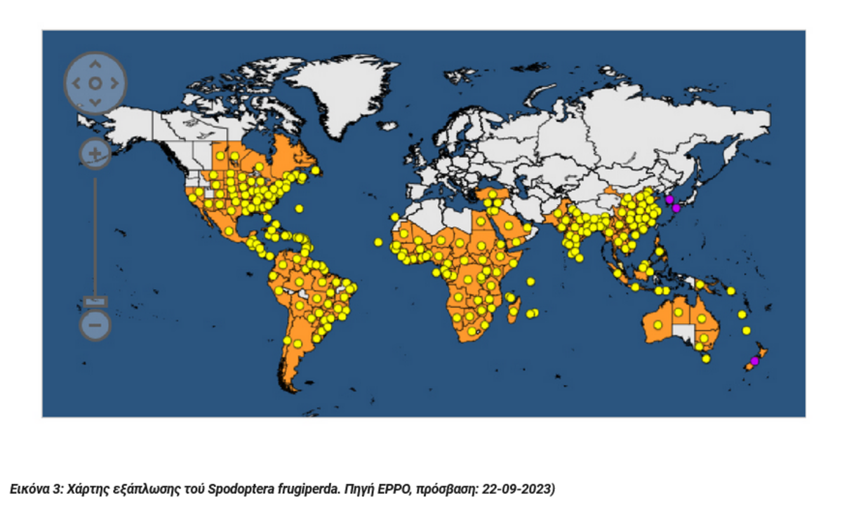 Το έντομο S. frugiperda είναι ιθαγενές των τροπικών και υποτροπικών περιοχών της Αμερικής. Το 2016 διαπιστώθηκε η παρουσία του στην Αφρική, σε περιοχές της Νιγηρίας, και σήμερα βρίσκεται σε περισσότερες από 30 Αφρικανικές χώρες. Το 2018 διαπιστώθηκε η παρουσία του εντόμου στην Ινδία, το 2019 στην Αίγυπτο, το 2020 στο Ισραήλ, το 2022 στην Τουρκία, ενώ το 2023 διαπιστώθηκε στο έδαφος της Κυπριακής Δημοκρατίας. Οι κλιματικές συνθήκες στη Μεσογείο θεωρούνται κατάλληλες για την εγκατάσταση του εντόμου που διαθέτει μεγάλο αριθμό κατάλληλων φυτών ξενιστών.