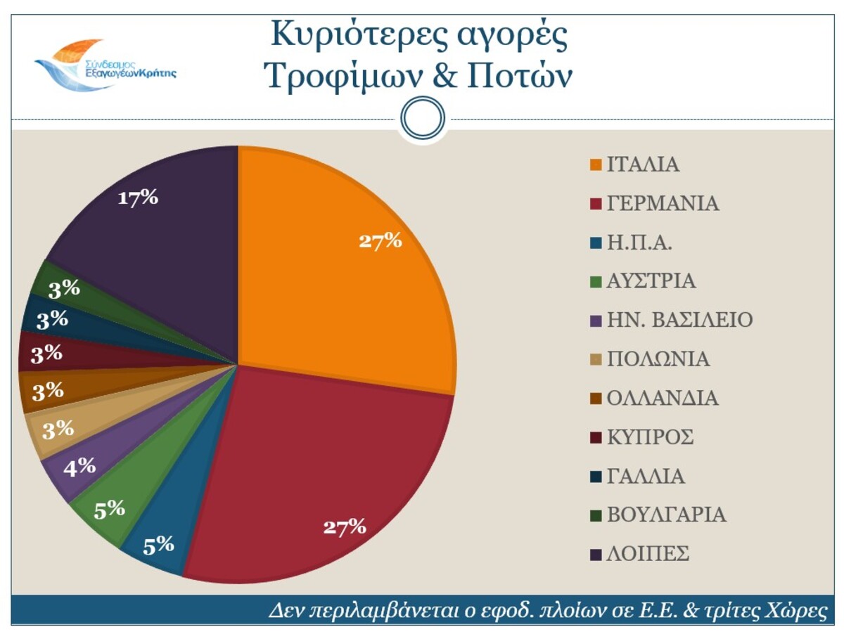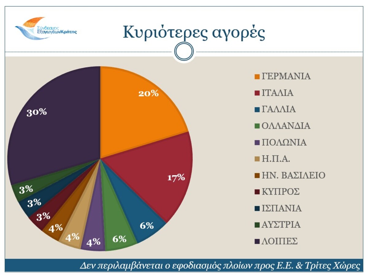 Σχετικά με τις αγορές, οι κυριότεροι αγοραστές των Κρητικών προϊόντων είναι η Γερμανία (μερίδιο 20,3%), η Ιταλία (17%), η Γαλλία (6,1%), η Ολλανδία (5,7%) και η Πολωνία (4,3%). Τη δεκάδα των κυριότερων αγοραστών κλείνουν οι Η.Π.Α., το Ηνωμένο Βασίλειο, η Κύπρος, η Ισπανία και η Αυστρία.