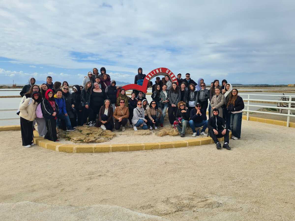 Το μεσημέρι της ίδιας ημέρας επισκεφθήκαμε τις αλυκές της Μαρσάλα (Saline di Marsala), οι οποίες συνδέονται μέσω του Μονοπατιού του Αλατιού με τις αλυκές της γειτονικής πόλης Τράπανι, αποτελώντας έναν από τους σημαντικότερους υδροβιότοπους της δυτικής Σικελίας. Οι μαθητές μας περπάτησαν ανάμεσα στις αλυκές, ενημερώθηκαν για τον παραδοσιακό τρόπο συλλογής του αλατιού, τη σύνδεσή του με βασικές αρχές της φυσικής, καθώς και για τον πλούτο της περιοχής σε χλωρίδα και πανίδα. Αν και λόγω εποχής δεν καταφέραμε να δούμε τα εντυπωσιακά φλαμίνγκο που συχνάζουν εκεί, μάθαμε με ενδιαφέρον από πού προέρχεται το χαρακτηριστικό ροζ χρώμα τους!
