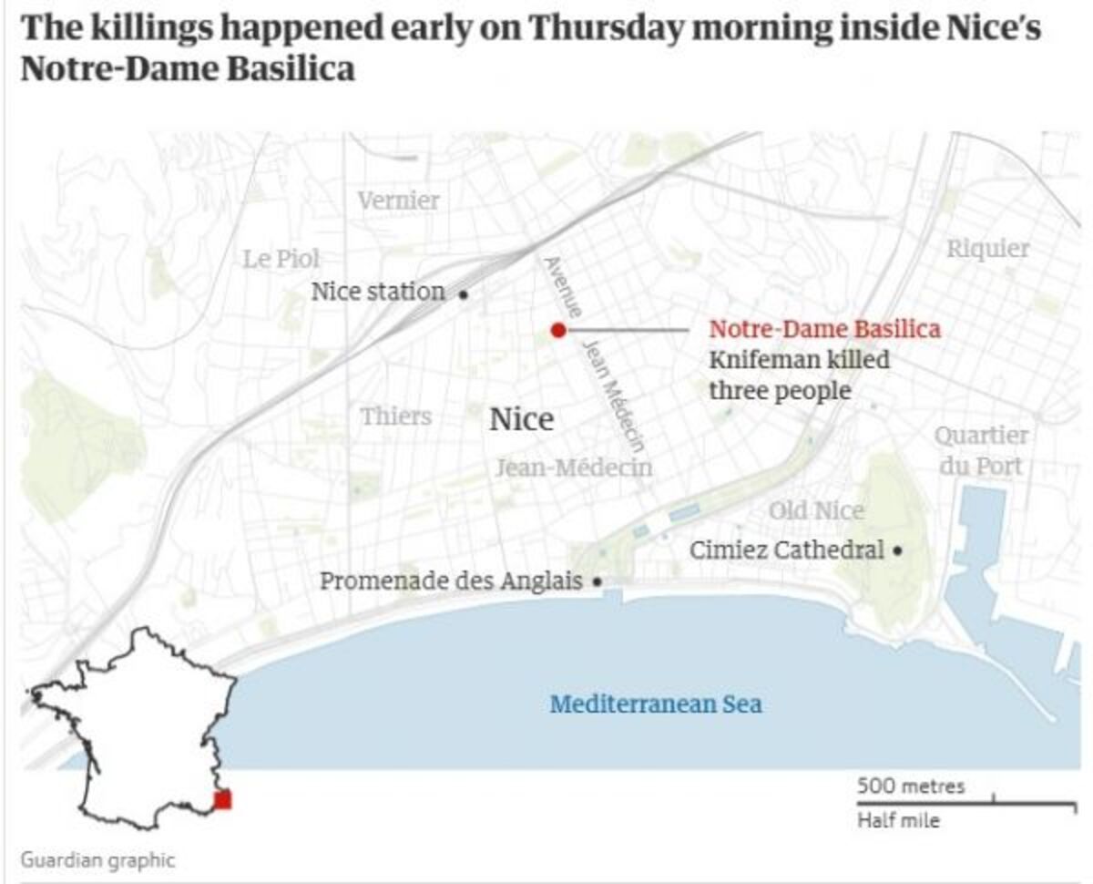Ο 21χρονος μπήκε στην εκκλησία και έσπειρε τον θάνατο. Αποκεφάλισε μια 60χρονη γυναίκα, έκοψε τον λαιμό ενός 55χρονου και μαχαίρωσε πολλές φορές μια 44χρονη, η οποία κατάφερε να βγει από τον ναό αλλά τελικά υπέκυψε στα τραύματά της.