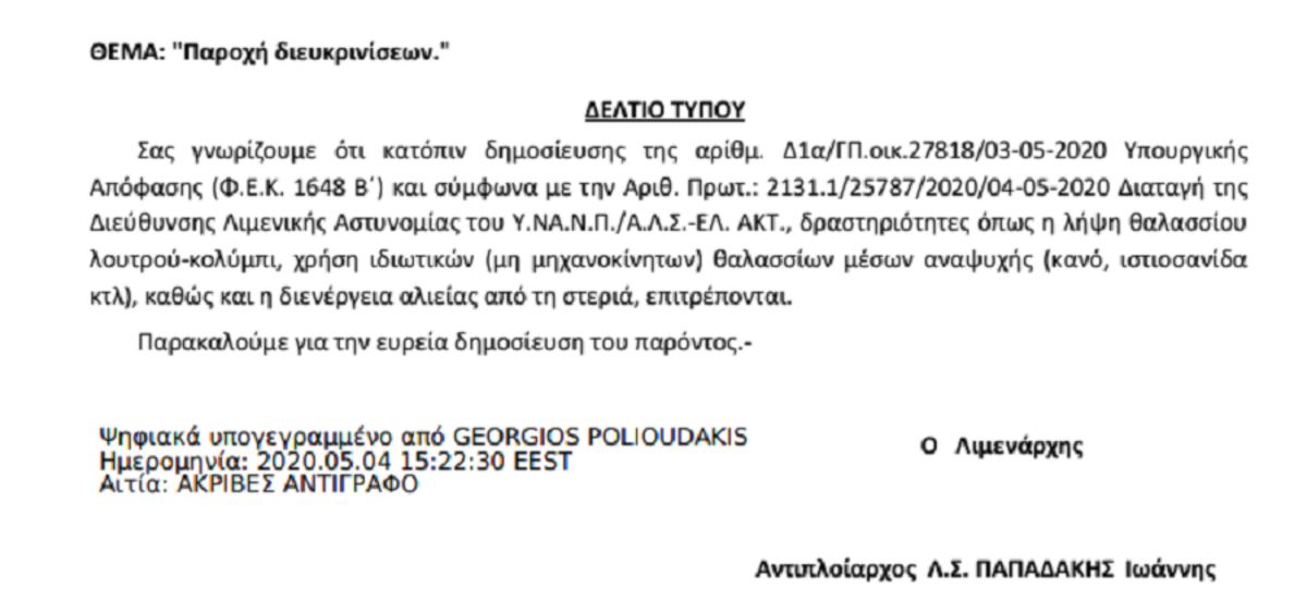 Επιτρέπεται από σήμερα το κολύμπι στη θάλασσα ΛΑΣΙΘΙ ΙΕΡΑΠΕΤΡΑ 2:47 μ.μ. - Δευτέρα 4 Μαΐου 2020 02:05 μ.μ. - Δευ, 04/47/2020 ΛΙΜΕΝΑΡΧΕΙΟ ΙΕΡΑΠΕΤΡΑΣ, ΚΟΛΥΜΠΙ Τι αναφέρει η ανακοίνωση του Λιμεναρχείου Ιεράπετρας