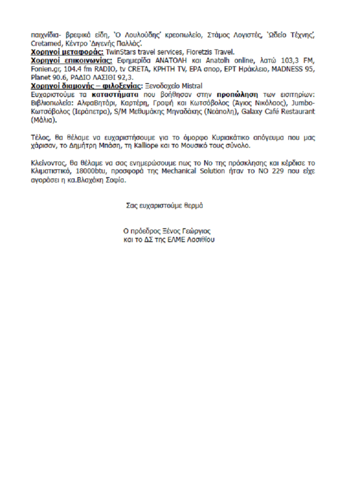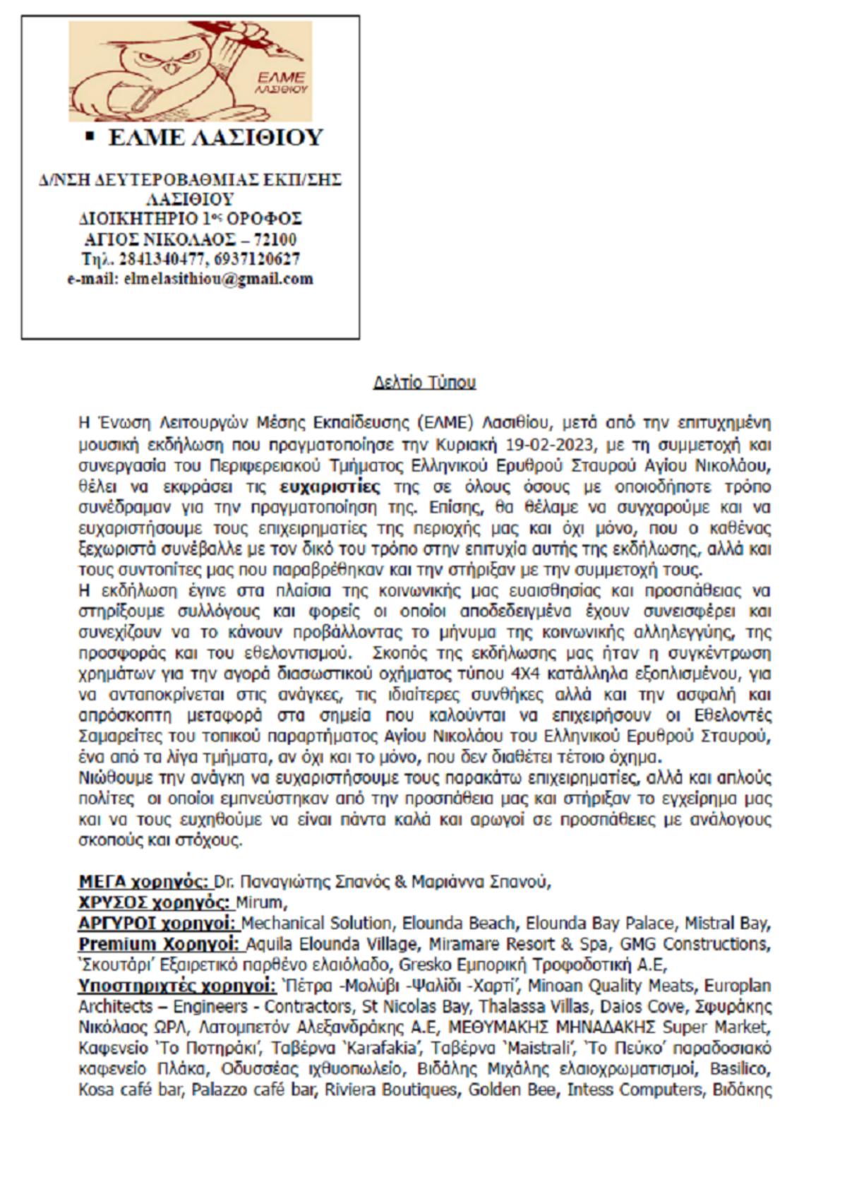 Ευχαριστήριο ΕΛΜΕ Λασιθίου για την επιτυχημένη εκδήλωση με τον Δ. Μπάση ΕΝΟΤΗΤΕΣ ΚΟΙΝΩΝΙΑ 9:40 π.μ. - Παρασκευή 10 Μαρτίου 2023 09:03 π.μ. - Παρ, 10/40/2023 ΕΚΔΗΛΩΣΗ, ΕΥΧΑΡΙΣΤΗΡΙΟ, ΕΛΜΕ ΛΑΣΙΘΙΟΥ, ΔΕΛΤΙΟ ΤΥΠΟΥ Αναλυτικά η ανακοίνωση
