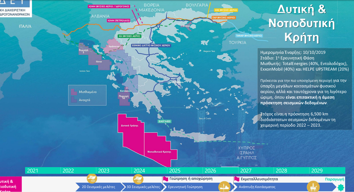Η ημερομηνία έναρξης της έρευνας για κοιτάσματα υδρογονανθράκων σε δύο μεγάλα θαλάσσια οικόπεδα δυτικά και νοτιοδυτικά της Κρήτης ήταν η 10η Οκτωβρίου του 2019. Μισθωτές είναι οι Total Energies (40%, εντολοδόχος), ExxonMobil (40%) και Helpe Upstream (20%).
