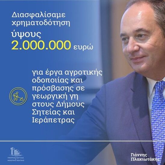 Έπειτα από συνεργασία, όπως ανακοινώθηκε, του Υπουργού Ναυτιλίας και Νησιωτικής Πολιτικής κ. Γιάννη Πλακιωτάκη με τον Υπουργό Αγροτικής Ανάπτυξης και Τροφίμων Γ. Γεωργαντά και τον Γενικό Γραμματέα Ενωσιακών Πόρων κ. Υποδομών, κ. Δημήτρη Οδ. Παπαγιαννίδη, εγκρίθηκε χρηματοδότηση συνολικού ύψους 2.000.000, εκατ. ευρώ προς τους Δήμους Ιεράπετρας και Σητείας.