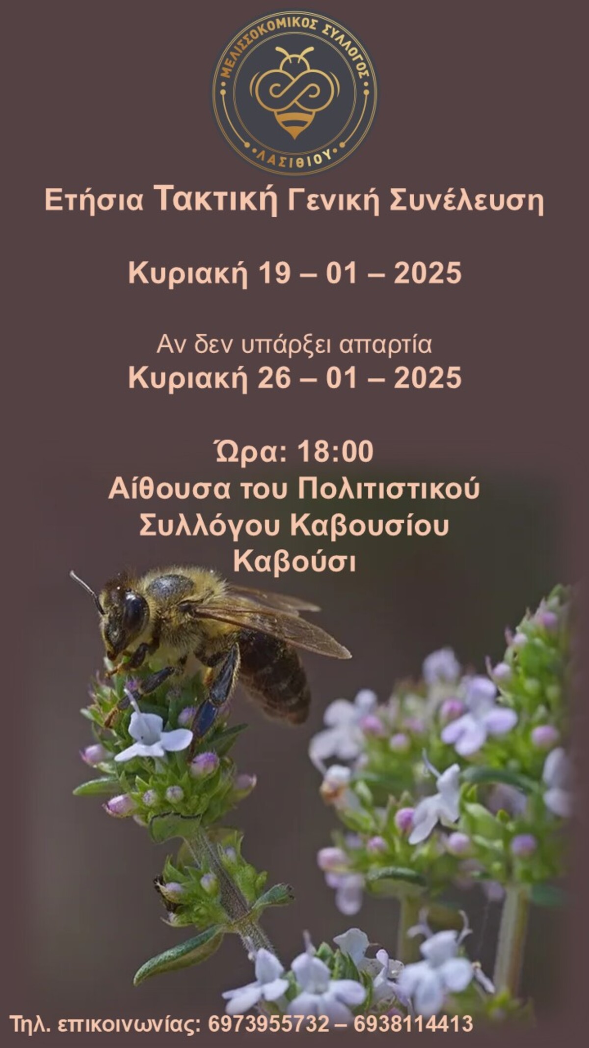 Την ερχόμενη Κυριακή 26/1/2025 στο Καβούσι στην κοπή της πίτας του Μελισσοκομικού Συλλόγου Λασιθίου θεωρούμαι ότι είναι η πιο σημαντική Γενική Συνέλευση των τελευταίων ετών.