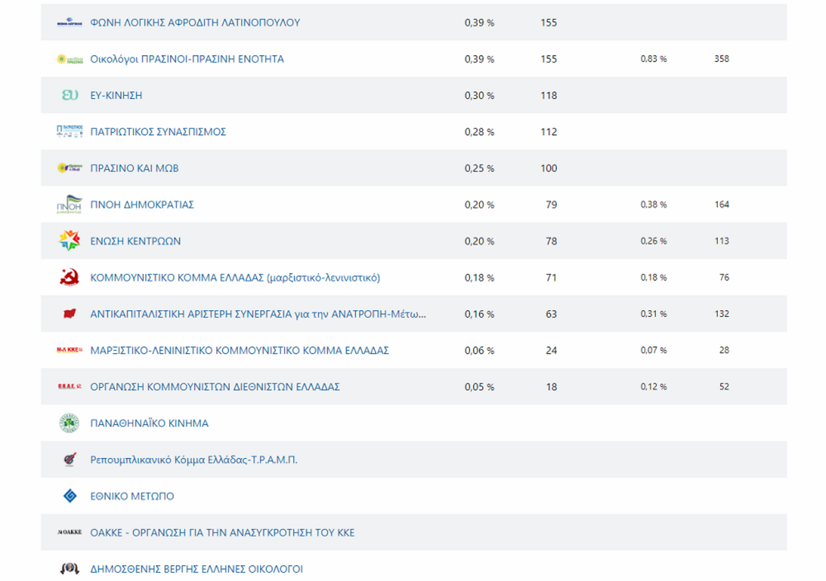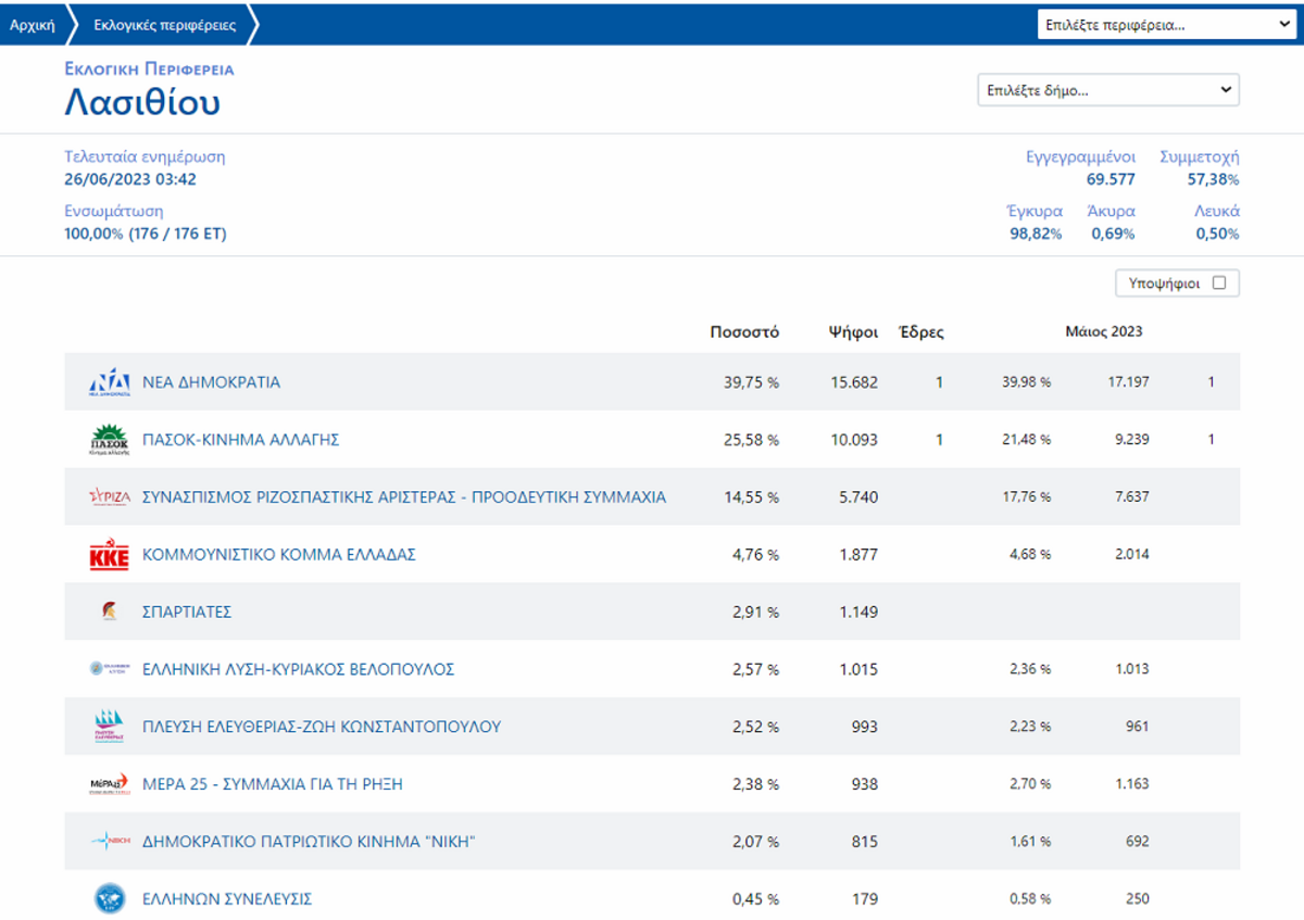Στον νομό Λασιθίου η ΝΔ έλαβε 39,75%, το ΠΑΣΟΚ –ΚΙΝΑΛ 25,58%, ο ΣΥΡΙΖΑ 14,55% και ακολουθούν ΚΚΕ, ΣΠΑΡΤΙΑΤΕΣ, ΕΛΛΗΝΙΚΗ ΛΥΣΗ, ΠΛΕΥΣΗ ΕΛΕΥΘΕΡΙΑΣ, ΜΕΡΑ25 και τα λοιπά κόμματα