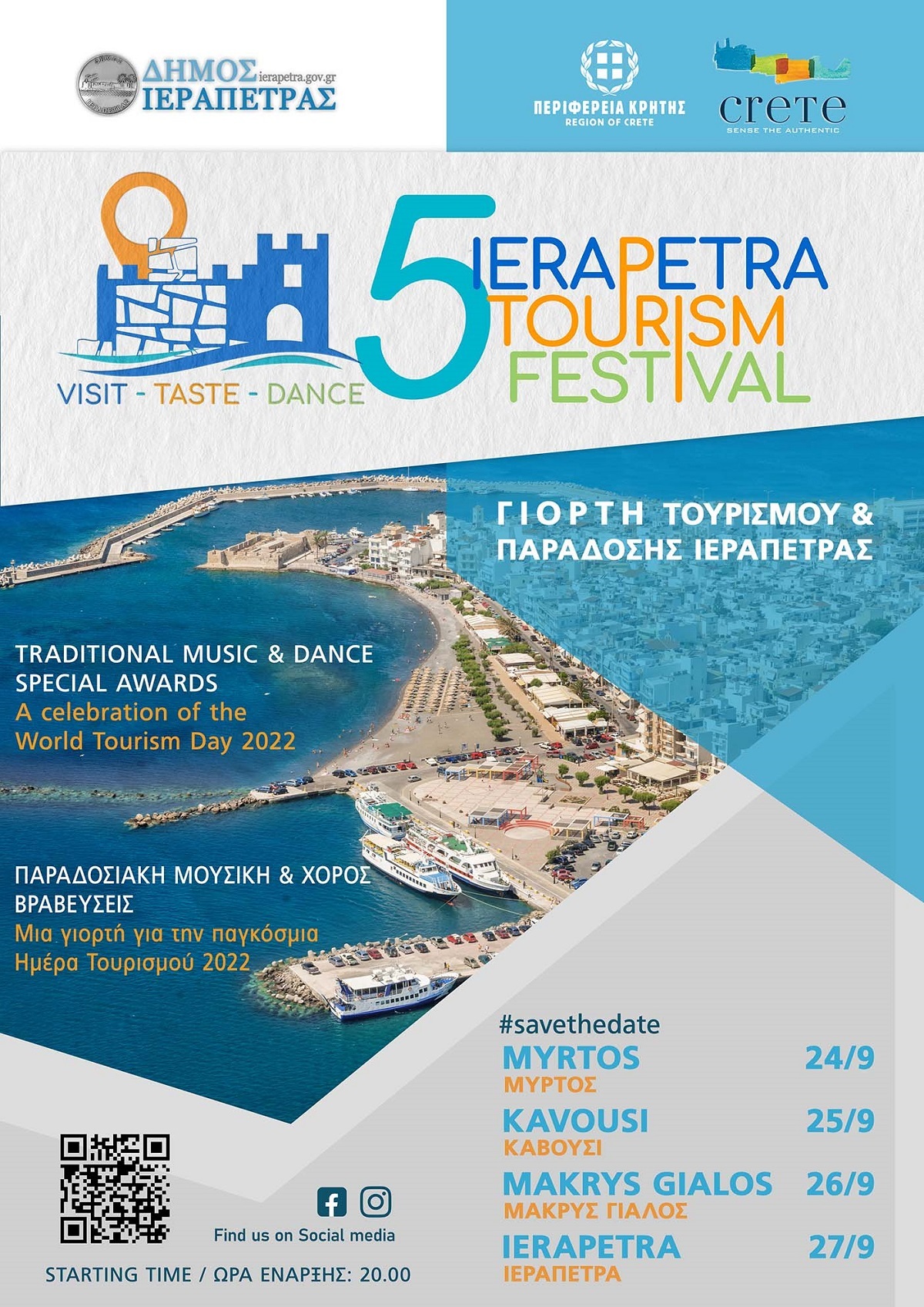 Με αφορμή την παγκόσμια ημέρα τουρισμού θα πραγματοποιηθούν εκδηλώσεις σε Ιεράπετρα, Μακρύ Γιαλό, Μύρτος Καβούσι από 24-27 Σεπτέμβρη. Το 5ο φεστιβάλ τουρισμού στην Ιεράπετρα θα περιλαμβάνει παραδοσιακή μουσική, χορό και βραβεύσεις. Διοργανώνεται από τον Δήμο Ιεράπετρας σε συνδιοργάνωση με την Περιφέρεια Κρήτης.