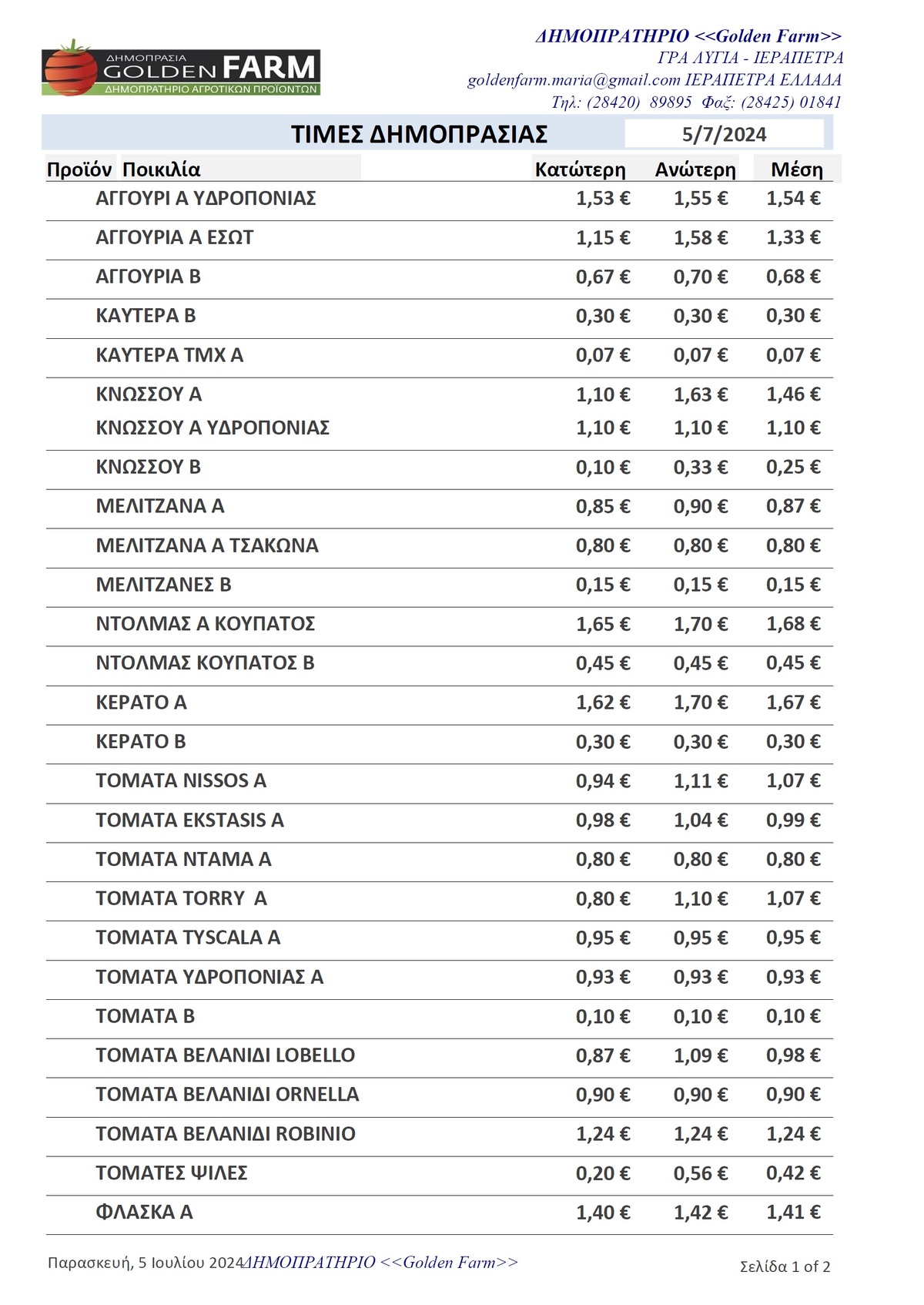 GOLDEN FARM | Τιμές Αγροτικών Προϊόντων 05.07.2024 ΤΙΜΕΣ 4:06 μ.μ. - Παρασκευή 5 Ιουλίου 2024 04:07 μ.μ. - Παρ, 05/06/2024 ΙΕΡΑΠΕΤΡΑ, ΤΙΜΕΣ ΑΓΡΟΤΙΚΩΝ ΠΡΟΙΟΝΤΩΝ , ΔΗΜΟΠΡΑΤΗΡΙΟ, ΚΗΠΕΥΤΙΚΑ , GOLDEN FARM Δείτε τις σημερινές τιμές του δημοπρατηρίου