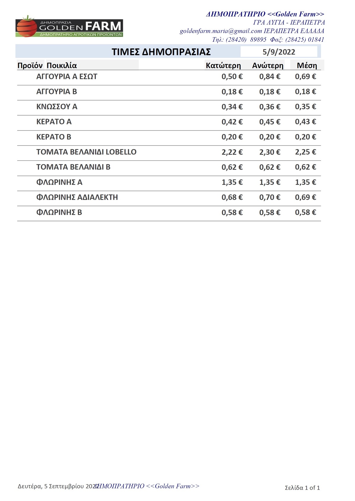 GOLDEN FARM | Τιμές Αγροτικών Προϊόντων 05.09.2022 ΛΑΣΙΘΙ ΙΕΡΑΠΕΤΡΑ 1:27 μ.μ. - Δευτέρα, 5 Σεπτεμβρίου 2022 01:09 μ.μ. - Δευ, 05/27/2022 ΤΙΜΕΣ , GOLDENFARM Δείτε τις σημερνές τιμές του δημοπρατηρίου