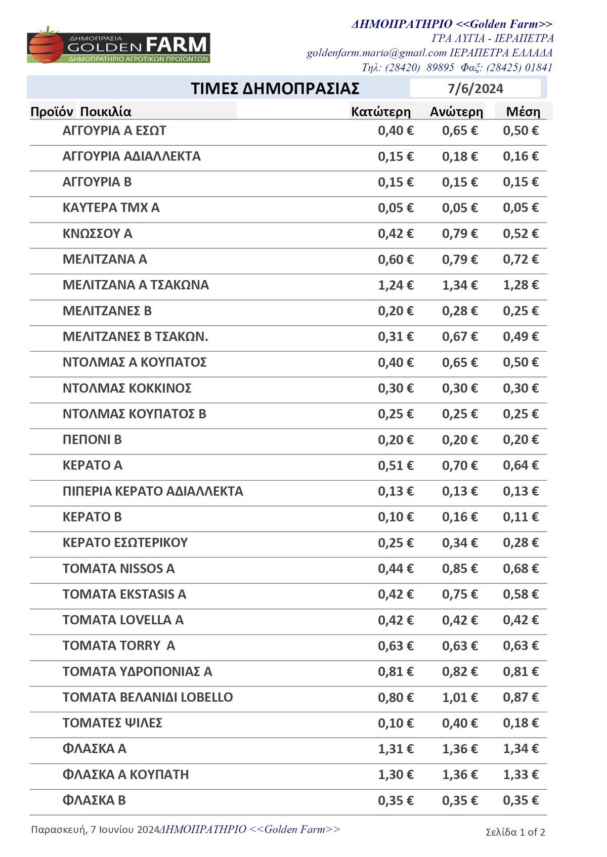 GOLDEN FARM | Τιμές Αγροτικών Προϊόντων 07.06.2024 ΤΙΜΕΣ 6:18 μ.μ. - Παρασκευή 7 Ιουνίου 2024 06:06 μ.μ. - Παρ, 07/18/2024 ΙΕΡΑΠΕΤΡΑ, ΤΙΜΕΣ ΑΓΡΟΤΙΚΩΝ ΠΡΟΙΟΝΤΩΝ , ΔΗΜΟΠΡΑΤΗΡΙΟ, ΚΗΠΕΥΤΙΚΑ , GOLDEN FARM Δείτε τις σημερινές τιμές του δημοπρατηρίου