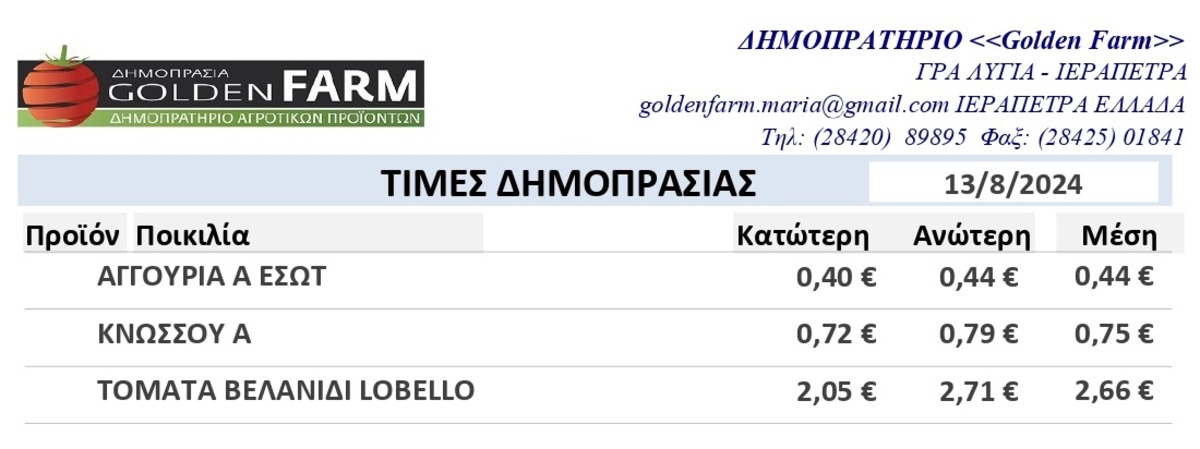 GOLDEN FARM | Τιμές Αγροτικών Προϊόντων 13.08.2024 ΤΙΜΕΣ 12:51 μ.μ. - Τρίτη 13 Αυγούστου 2024 12:08 μ.μ. - Τρί, 13/51/2024 ΤΙΜΕΣ ΑΓΡΟΤΙΚΩΝ ΠΡΟΙΟΝΤΩΝ Δείτε τις τιμές του δημοπρατηρίου