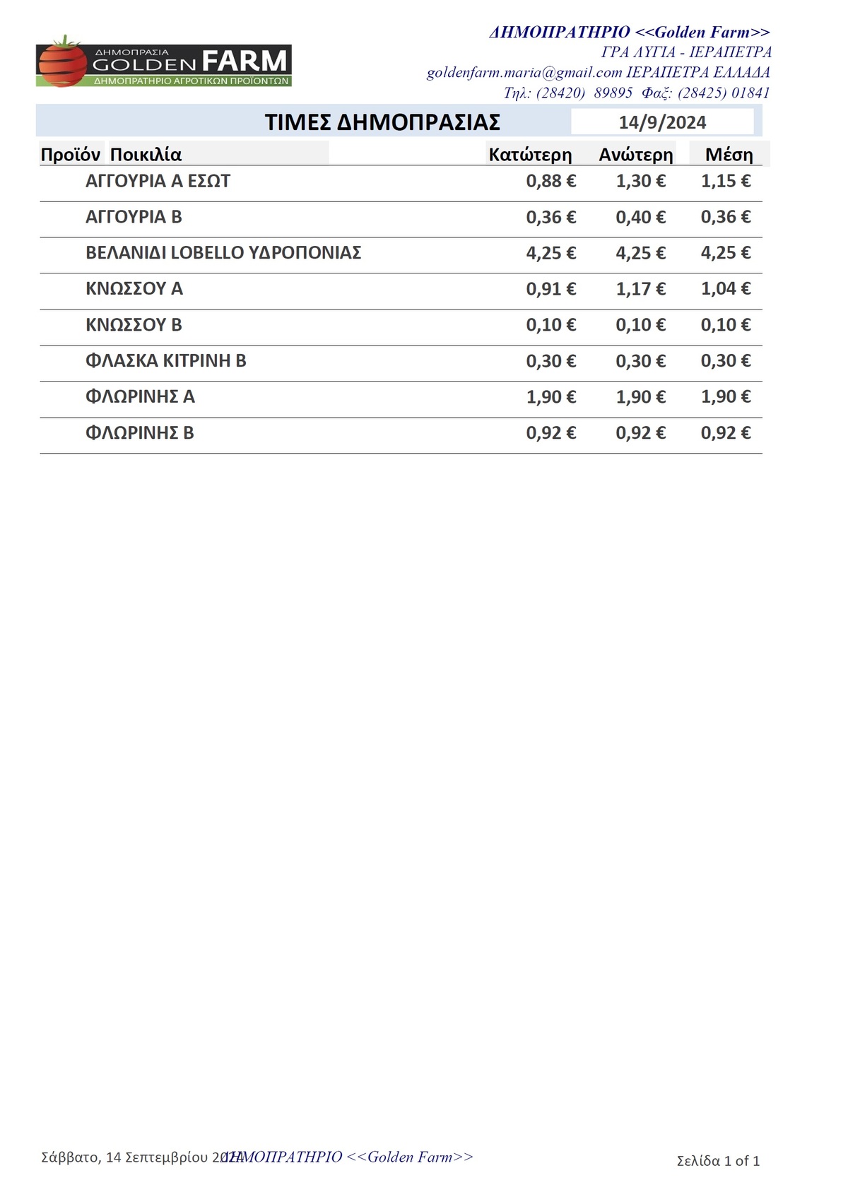 GOLDEN FARM | Τιμές Αγροτικών Προϊόντων 14.09.2024 ΤΙΜΕΣ 1:57 μ.μ. - Σάββατο 14 Σεπτεμβρίου 2024 01:09 μ.μ. - Σάβ, 14/57/2024 ΙΕΡΑΠΕΤΡΑ, ΤΙΜΕΣ ΑΓΡΟΤΙΚΩΝ ΠΡΟΙΟΝΤΩΝ , ΔΗΜΟΠΡΑΤΗΡΙΟ, ΚΗΠΕΥΤΙΚΑ , GOLDEN FARM Δείτε τις τιμές του δημοπρατηρίου