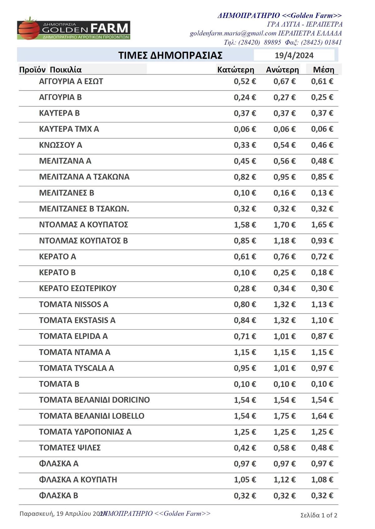 GOLDEN FARM | Τιμές Αγροτικών Προϊόντων 19.04.2024 ΤΙΜΕΣ 4:29 μ.μ. - Παρασκευή 19 Απριλίου 2024 04:04 μ.μ. - Παρ, 19/29/2024 ΙΕΡΑΠΕΤΡΑ, ΤΙΜΕΣ ΑΓΡΟΤΙΚΩΝ ΠΡΟΙΟΝΤΩΝ , ΔΗΜΟΠΡΑΤΗΡΙΟ, ΚΗΠΕΥΤΙΚΑ , GOLDEN FARM Δείτε τις σημερινές τιμές του δημοπρατηρίου