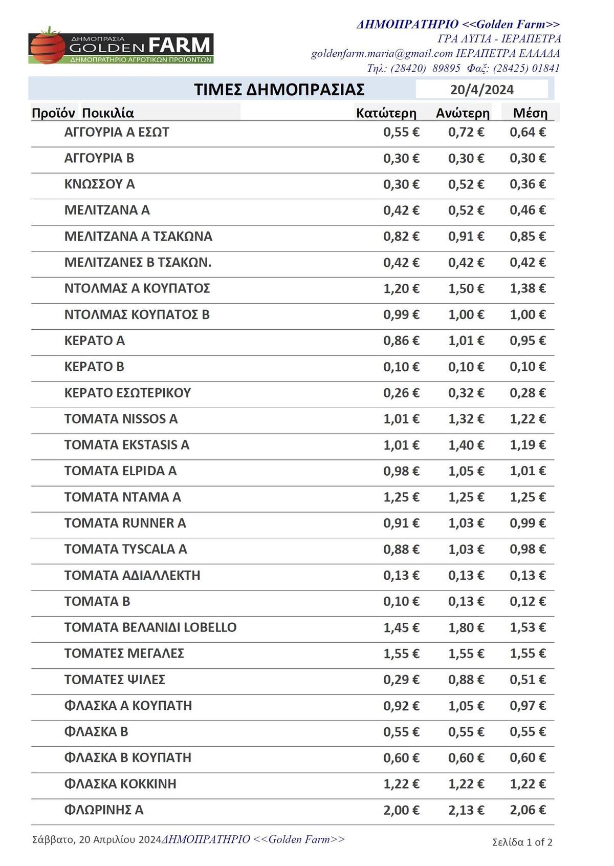 GOLDEN FARM | Τιμές Αγροτικών Προϊόντων 20.04.2024 ΤΙΜΕΣ 5:21 μ.μ. - Σάββατο 20 Απριλίου 2024 05:04 μ.μ. - Σάβ, 20/21/2024 ΙΕΡΑΠΕΤΡΑ, ΤΙΜΕΣ ΑΓΡΟΤΙΚΩΝ ΠΡΟΙΟΝΤΩΝ , ΔΗΜΟΠΡΑΤΗΡΙΟ, ΚΗΠΕΥΤΙΚΑ , GOLDEN FARM Δείτε τις σημερινές τιμές του δημοπρατηρίου