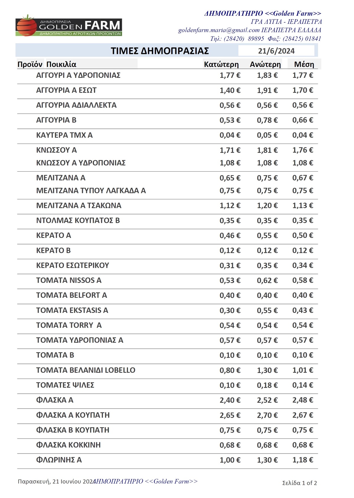 GOLDEN FARM | Τιμές Αγροτικών Προϊόντων 21.06.2024 ΤΙΜΕΣ 4:50 μ.μ. - Παρασκευή 21 Ιουνίου 2024 04:06 μ.μ. - Παρ, 21/50/2024 ΙΕΡΑΠΕΤΡΑ, ΤΙΜΕΣ ΑΓΡΟΤΙΚΩΝ ΠΡΟΙΟΝΤΩΝ , ΔΗΜΟΠΡΑΤΗΡΙΟ, ΚΗΠΕΥΤΙΚΑ , GOLDEN FARM Δείτε τις σημερινές τιμές του δημοπρατηρίου