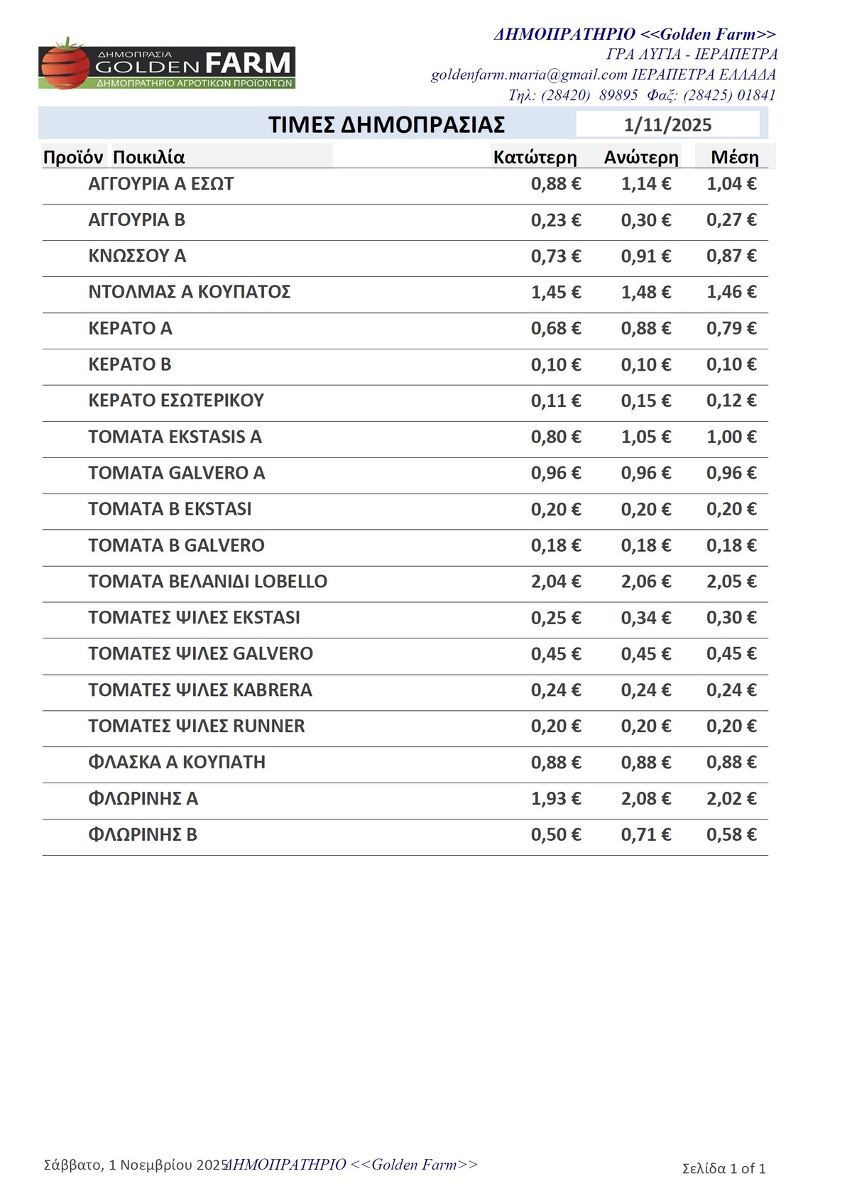 GOLDEN FARM |Τιμές Αγροτικών Προϊόντων 01.11.2025 ΤΙΜΕΣ 3:21 μ.μ. - Σάββατο, 1 Νοεμβρίου 2025 03:11 μ.μ. - Σάβ, 01/21/2025 ΙΕΡΑΠΕΤΡΑ, ΤΙΜΕΣ ΑΓΡΟΤΙΚΩΝ ΠΡΟΙΟΝΤΩΝ , ΔΗΜΟΠΡΑΤΗΡΙΟ, ΚΗΠΕΥΤΙΚΑ , GOLDEN FARM Δείτε τις σημερινές τιμές του δημοπρατηρίου