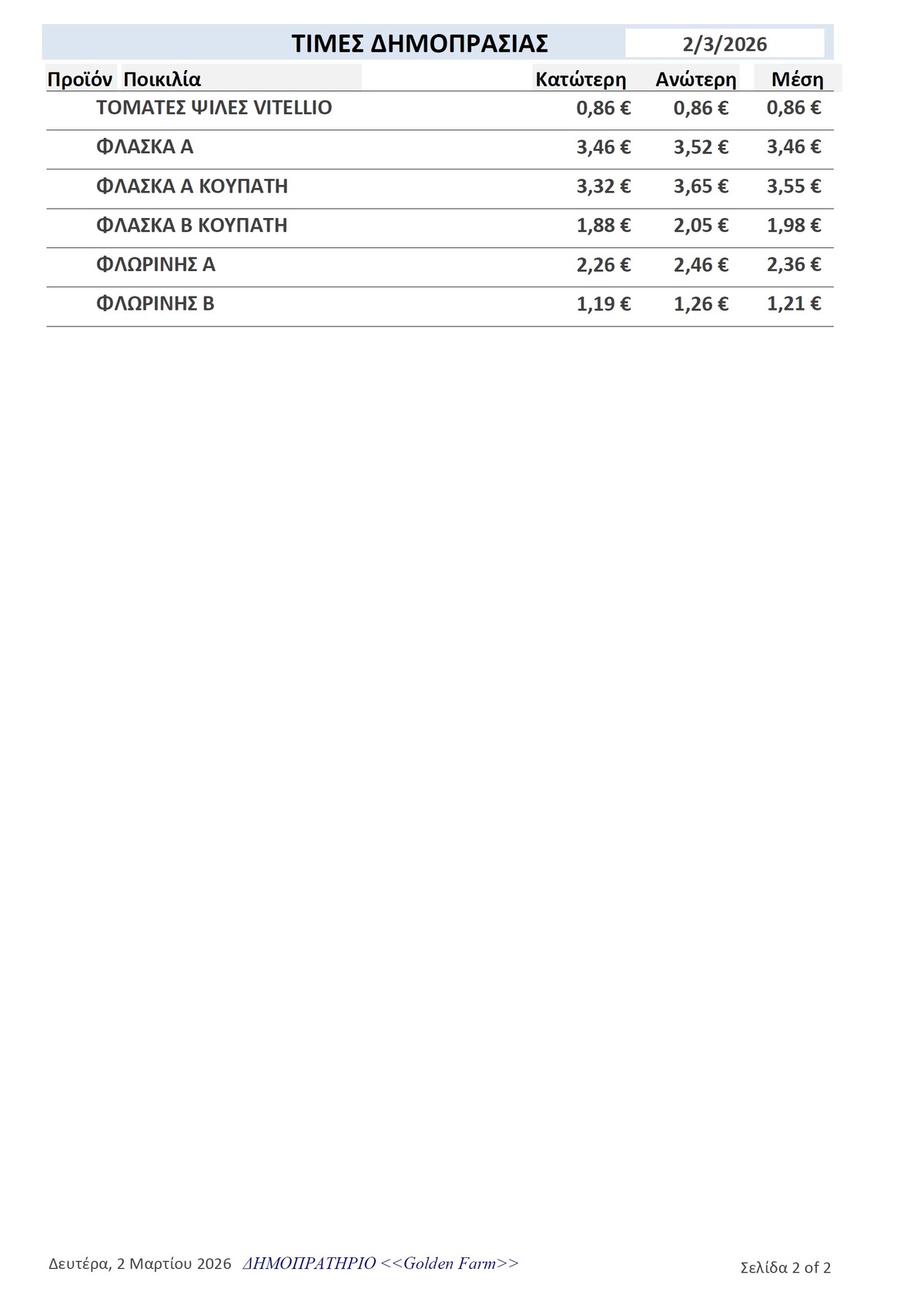 GOLDEN FARM |Τιμές Αγροτικών Προϊόντων 02.03.2026 ΤΙΜΕΣ 5:36 μ.μ. - Δευτέρα 2 Μαρτίου 2026 05:03 μ.μ. - Δευ, 02/36/2026 ΙΕΡΑΠΕΤΡΑ, ΤΙΜΕΣ ΑΓΡΟΤΙΚΩΝ ΠΡΟΙΟΝΤΩΝ , ΚΗΠΕΥΤΙΚΑ , ΔΗΜΟΠΡΑΣΙΑ, GOLDEN FARM Δείτε τις σημερινές τιμές του δημοπρατηρίου