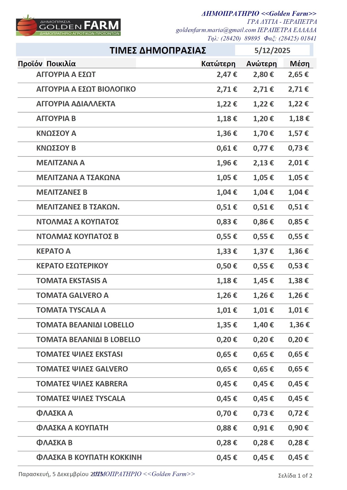 GOLDEN FARM |Τιμές Αγροτικών Προϊόντων 05.12.2025 ΤΙΜΕΣ 4:24 μ.μ. - Παρασκευή 5 Δεκεμβρίου 2025 04:12 μ.μ. - Παρ, 05/24/2025 ΙΕΡΑΠΕΤΡΑ, ΤΙΜΕΣ ΑΓΡΟΤΙΚΩΝ ΠΡΟΙΟΝΤΩΝ , ΔΗΜΟΠΡΑΤΗΡΙΟ, ΚΗΠΕΥΤΙΚΑ , GOLDEN FARM Δείτε τις σημερινές τιμές του δημοπρατηρίου