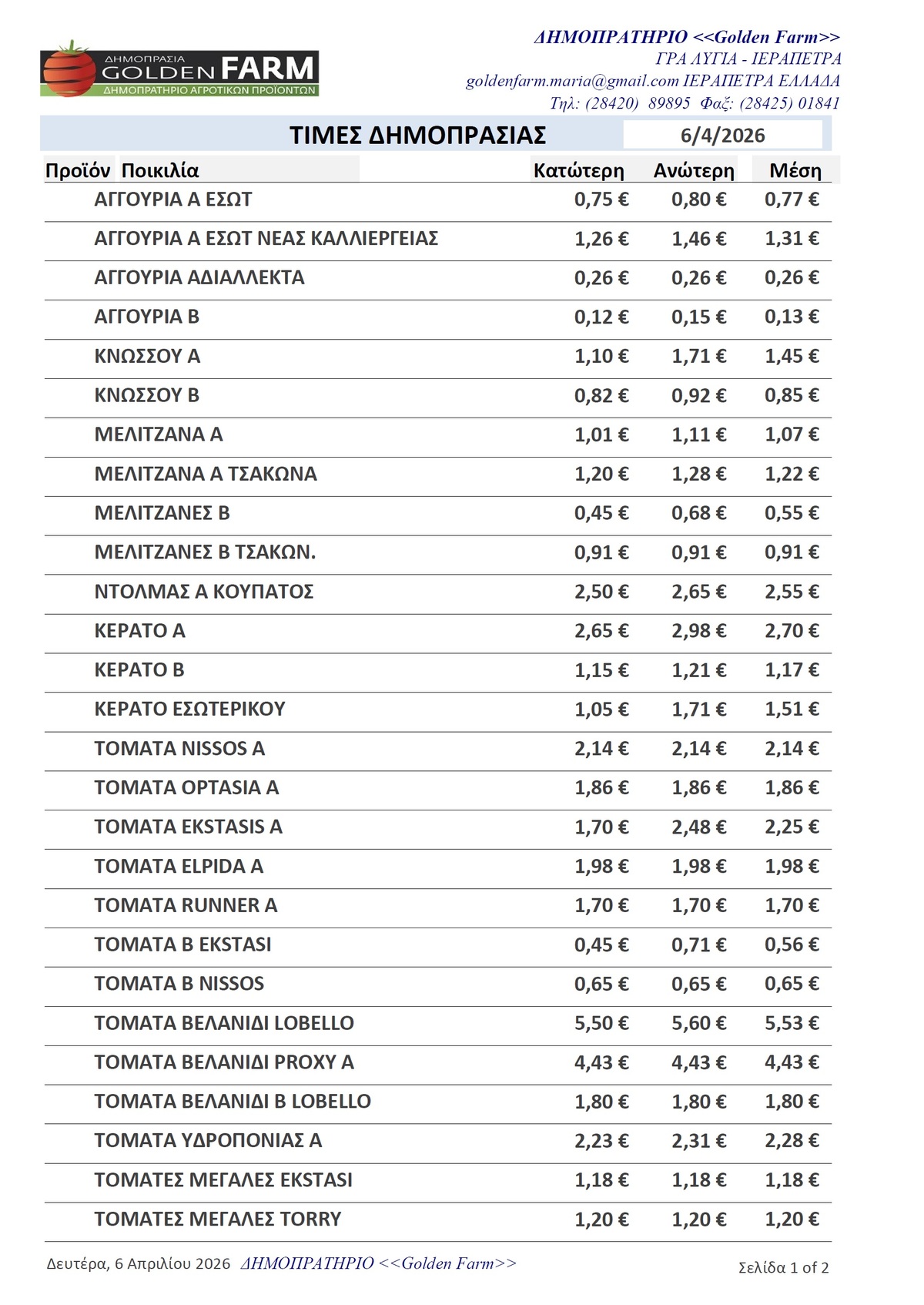 GOLDEN FARM |Τιμές Αγροτικών Προϊόντων 06.04.2026 ΤΙΜΕΣ 2:04 μ.μ. - Δευτέρα 6 Απριλίου 2026 02:04 μ.μ. - Δευ, 06/04/2026 ΙΕΡΑΠΕΤΡΑ, ΤΙΜΕΣ ΑΓΡΟΤΙΚΩΝ ΠΡΟΙΟΝΤΩΝ , ΔΗΜΟΠΡΑΤΗΡΙΟ, ΚΗΠΕΥΤΙΚΑ , GOLDEN FARM Δείτε τις σημερινές τιμές του δημοπρατηρίου