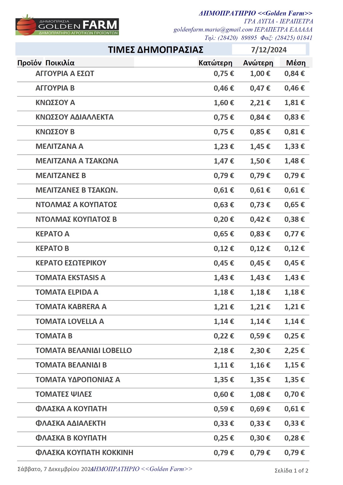 GOLDEN FARM |Τιμές Αγροτικών Προϊόντων 07.12.2024 ΤΙΜΕΣ 5:24 μ.μ. - Σάββατο 7 Δεκεμβρίου 2024 05:12 μ.μ. - Σάβ, 07/24/2024 ΙΕΡΑΠΕΤΡΑ, ΤΙΜΕΣ ΑΓΡΟΤΙΚΩΝ ΠΡΟΙΟΝΤΩΝ , ΔΗΜΟΠΡΑΤΗΡΙΟ, ΚΗΠΕΥΤΙΚΑ , GOLDEN FARM Δείτε τις σημερινές τιμές του δημοπρατηρίου