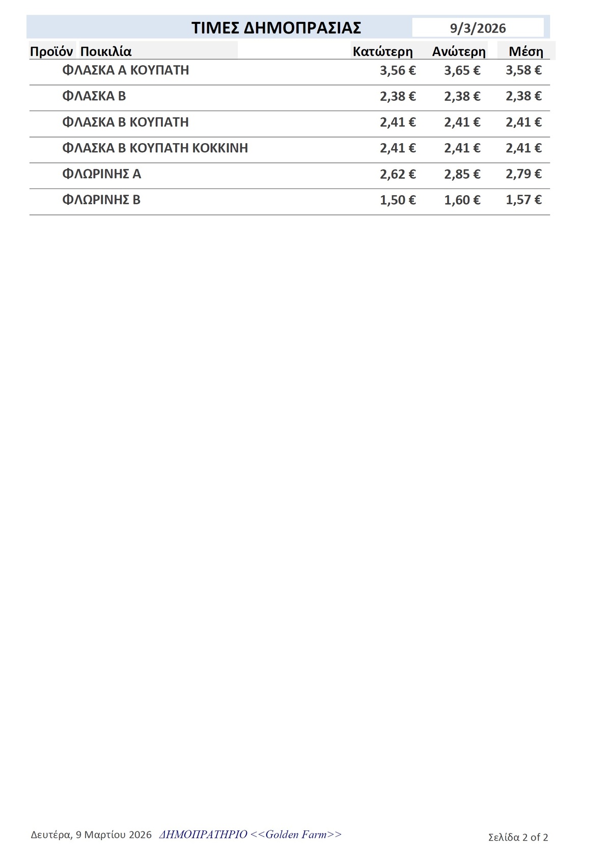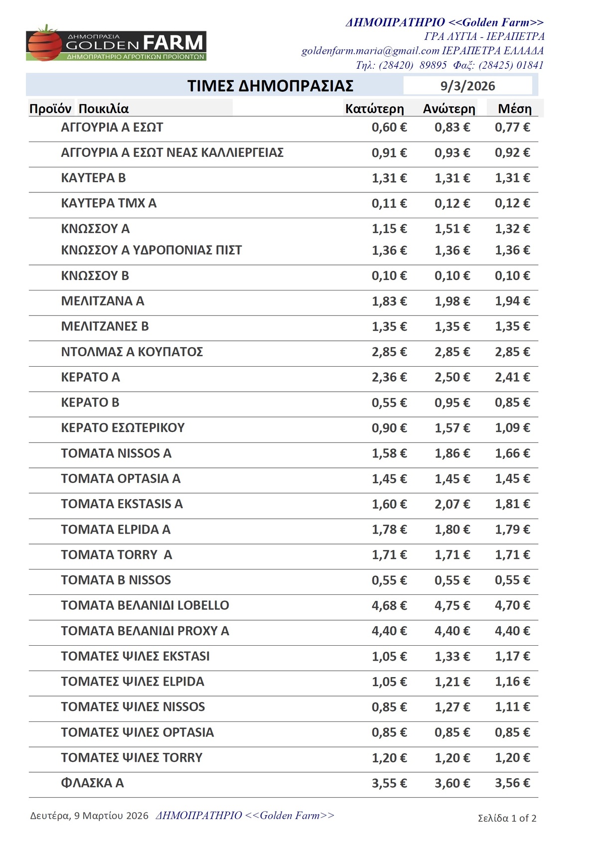 GOLDEN FARM |Τιμές Αγροτικών Προϊόντων 09.03.2026 ΤΙΜΕΣ 2:33 μ.μ. - Δευτέρα 9 Μαρτίου 2026 02:03 μ.μ. - Δευ, 09/33/2026 ΙΕΡΑΠΕΤΡΑ, ΤΙΜΕΣ ΑΓΡΟΤΙΚΩΝ ΠΡΟΙΟΝΤΩΝ , ΔΗΜΟΠΡΑΤΗΡΙΟ, ΚΗΠΕΥΤΙΚΑ , GOLDEN FARM Δείτε τις σημερινές τιμές του δημοπρατηρίου