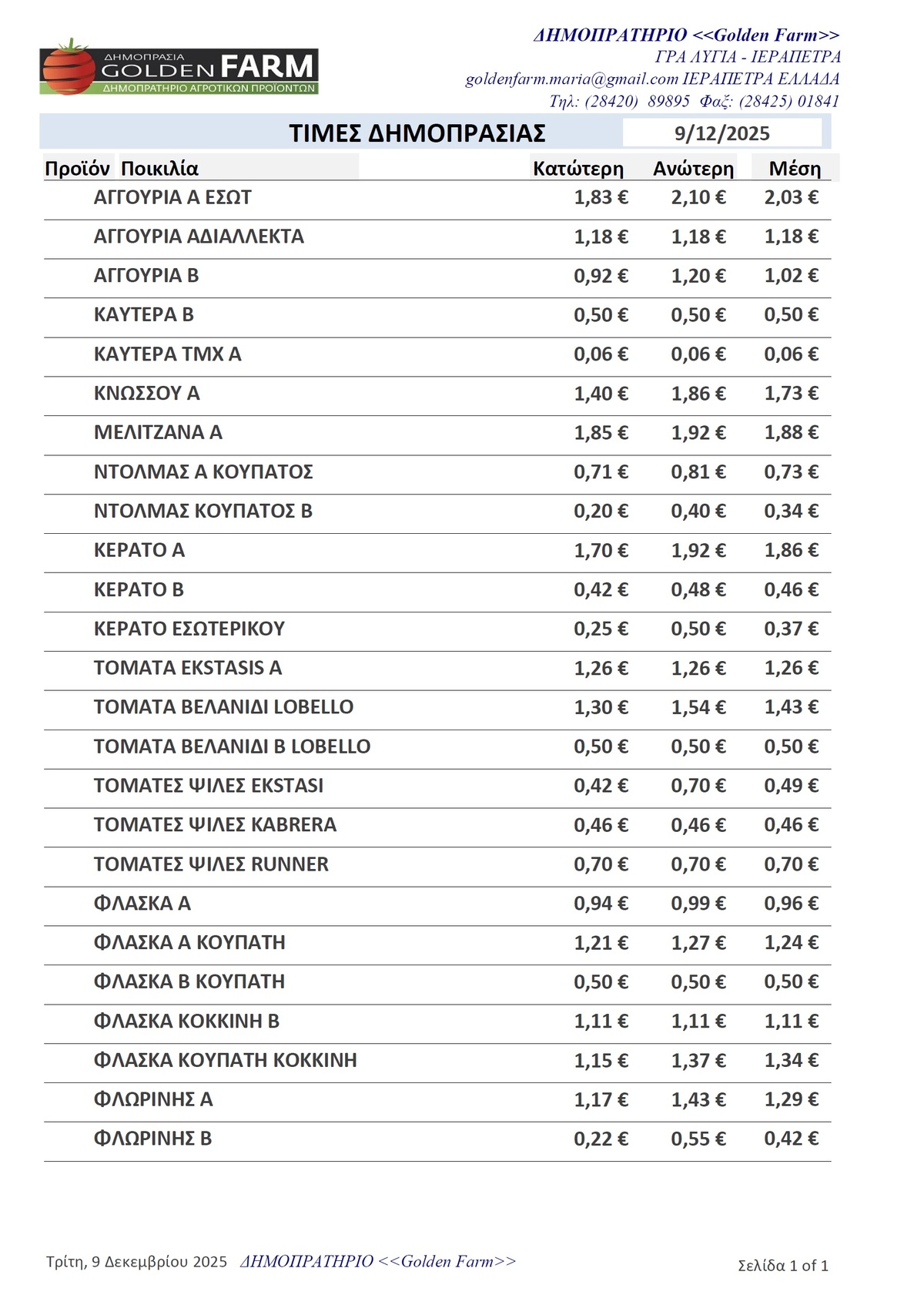 GOLDEN FARM |Τιμές Αγροτικών Προϊόντων 09.12.2025 ΤΙΜΕΣ 4:46 μ.μ. - Τρίτη, 9 Δεκεμβρίου 2025 04:12 μ.μ. - Τρί, 09/46/2025 ΙΕΡΑΠΕΤΡΑ, ΤΙΜΕΣ ΑΓΡΟΤΙΚΩΝ ΠΡΟΙΟΝΤΩΝ , ΔΗΜΟΠΡΑΤΗΡΙΟ, ΚΗΠΕΥΤΙΚΑ, GOLDEN FARM Δείτε τις σημερινές τιμές του δημοπρατηρίου