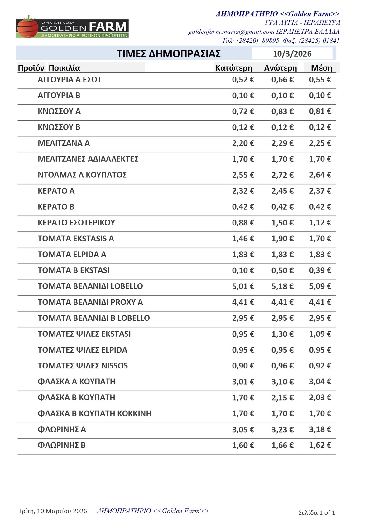 GOLDEN FARM |Τιμές Αγροτικών Προϊόντων 10.03.2026 ΤΙΜΕΣ 4:34 μ.μ. - Τρίτη 10 Μαρτίου 2026 04:03 μ.μ. - Τρί, 10/34/2026 ΙΕΡΑΠΕΤΡΑ, ΤΙΜΕΣ ΑΓΡΟΤΙΚΩΝ ΠΡΟΙΟΝΤΩΝ, ΔΗΜΟΠΡΑΤΗΡΙΟ, ΚΗΠΕΥΤΙΚΑ, GOLDEN FARM Δείτε τις σημερινές τιμές του δημοπρατηρίου