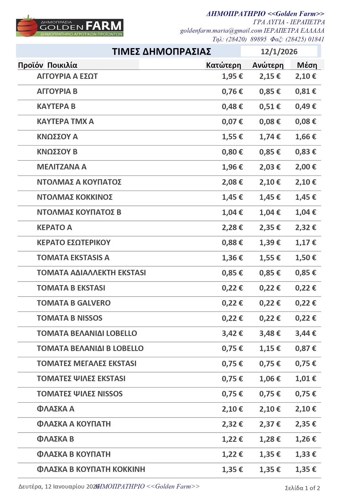 GOLDEN FARM |Τιμές Αγροτικών Προϊόντων 12.01.2026 ΤΙΜΕΣ 4:05 μ.μ. - Δευτέρα 12 Ιανουαρίου 2026 04:01 μ.μ. - Δευ, 12/05/2026 ΙΕΡΑΠΕΤΡΑ, ΤΙΜΕΣ ΑΓΡΟΤΙΚΩΝ ΠΡΟΙΟΝΤΩΝ , ΔΗΜΟΠΡΑΤΗΡΙΟ, ΚΗΠΕΥΤΙΚΑ , GOLDEN FARM Δείτε τις σημερινές τιμές του δημοπρατηρίου