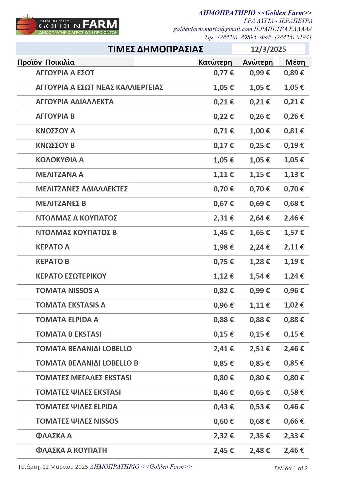 GOLDEN FARM |Τιμές Αγροτικών Προϊόντων 12.03.2025 ΤΙΜΕΣ 4:25 μ.μ. - Τετάρτη 12 Μαρτίου 2025 04:03 μ.μ. - Τετ, 12/25/2025 ΙΕΡΑΠΕΤΡΑ, ΤΙΜΕΣ ΑΓΡΟΤΙΚΩΝ ΠΡΟΙΟΝΤΩΝ , ΔΗΜΟΠΡΑΤΗΡΙΟ, ΚΗΠΕΥΤΙΚΑ , ΔΗΜΟΠΡΑΤΗΡΙΑ, GOLDEN FARM Δείτε τις σημερινές τιμές του δημοπρατηρίου