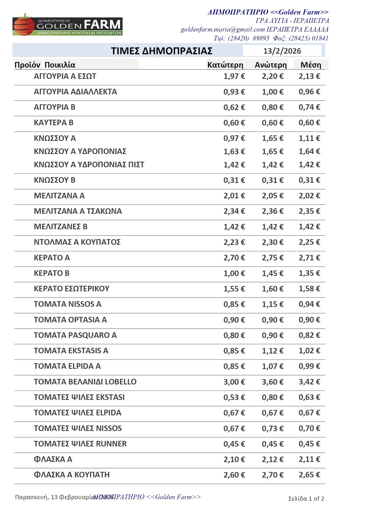 GOLDEN FARM |Τιμές Αγροτικών Προϊόντων 13.02.2026 ΤΙΜΕΣ 3:13 μ.μ. - Παρασκευή 13 Φεβρουαρίου 2026 03:02 μ.μ. - Παρ, 13/13/2026 ΙΕΡΑΠΕΤΡΑ, ΤΙΜΕΣ ΑΓΡΟΤΙΚΩΝ ΠΡΟΙΟΝΤΩΝ , ΔΗΜΟΠΡΑΤΗΡΙΟ, ΚΗΠΕΥΤΙΚΑ , GOLDEN FARM Δείτε τις σημερινές τιμές του δημοπρατηρίου