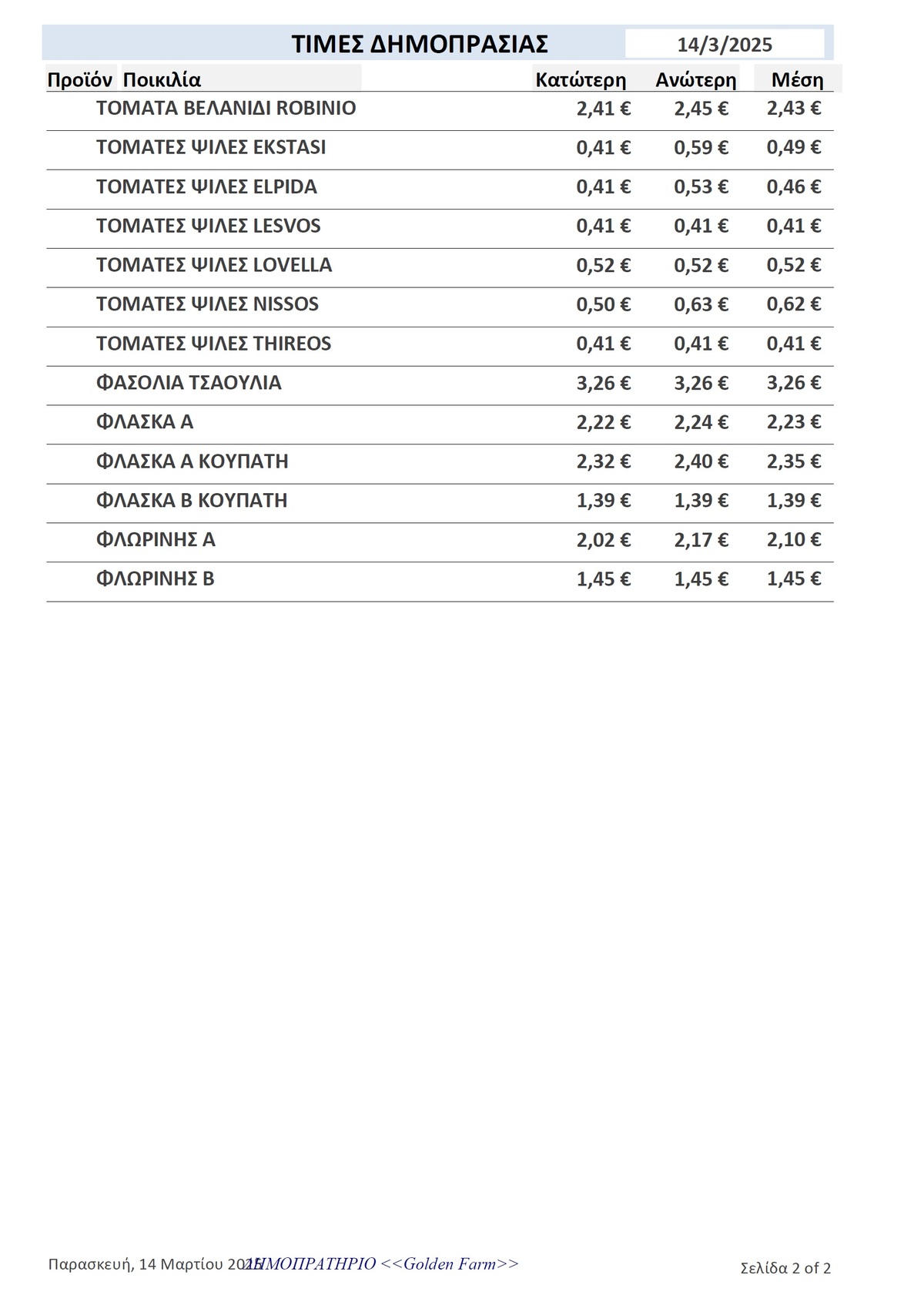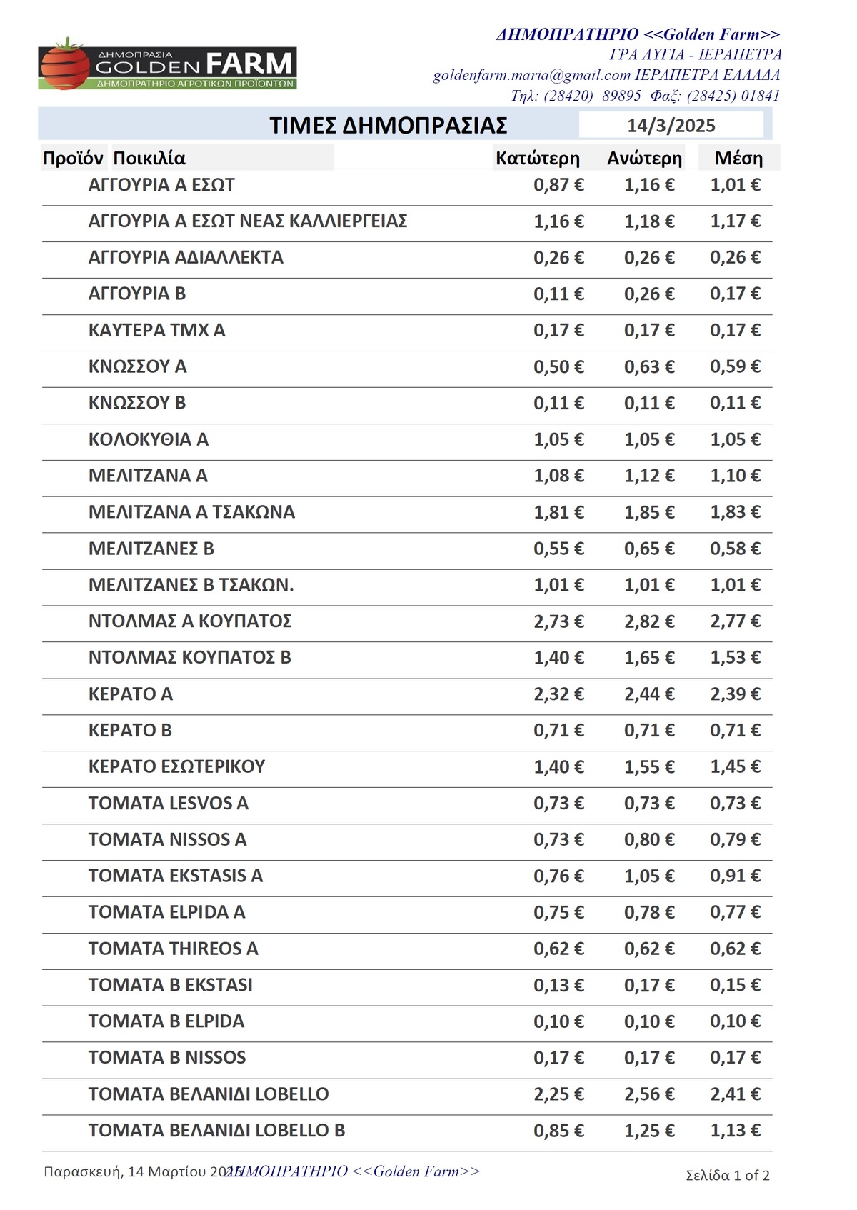 GOLDEN FARM |Τιμές Αγροτικών Προϊόντων 14.03.2025 ΤΙΜΕΣ 4:38 μ.μ. - Παρασκευή 14 Μαρτίου 2025 04:03 μ.μ. - Παρ, 14/38/2025 ΙΕΡΑΠΕΤΡΑ, ΤΙΜΕΣ ΑΓΡΟΤΙΚΩΝ ΠΡΟΙΟΝΤΩΝ , ΔΗΜΟΠΡΑΤΗΡΙΟ, ΚΗΠΕΥΤΙΚΑ , ΚΗΠΕΥΤΙΚΑ, GOLDEN FARM Δείτε τις σημερινές τιμές του δημοπρατηρίου