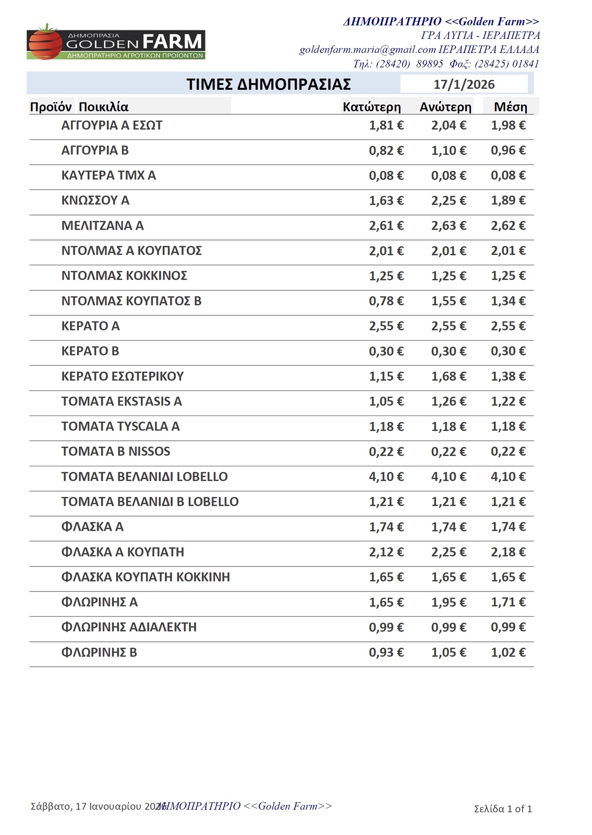 GOLDEN FARM |Τιμές Αγροτικών Προϊόντων 17.01.2026 ΤΙΜΕΣ 3:37 μ.μ. - Σάββατο, 17 Ιανουαρίου 2026 03:01 μ.μ. - Σάβ, 17/37/2026 ΙΕΡΑΠΕΤΡΑ, ΤΙΜΕΣ ΑΓΡΟΤΙΚΩΝ ΠΡΟΙΟΝΤΩΝ , ΔΗΜΟΠΡΑΤΗΡΙΟ, ΚΗΠΕΥΤΙΚΑ , GOLDEN FARM Δείτε τις σημερινές τιμές του δημοπρατηρίου