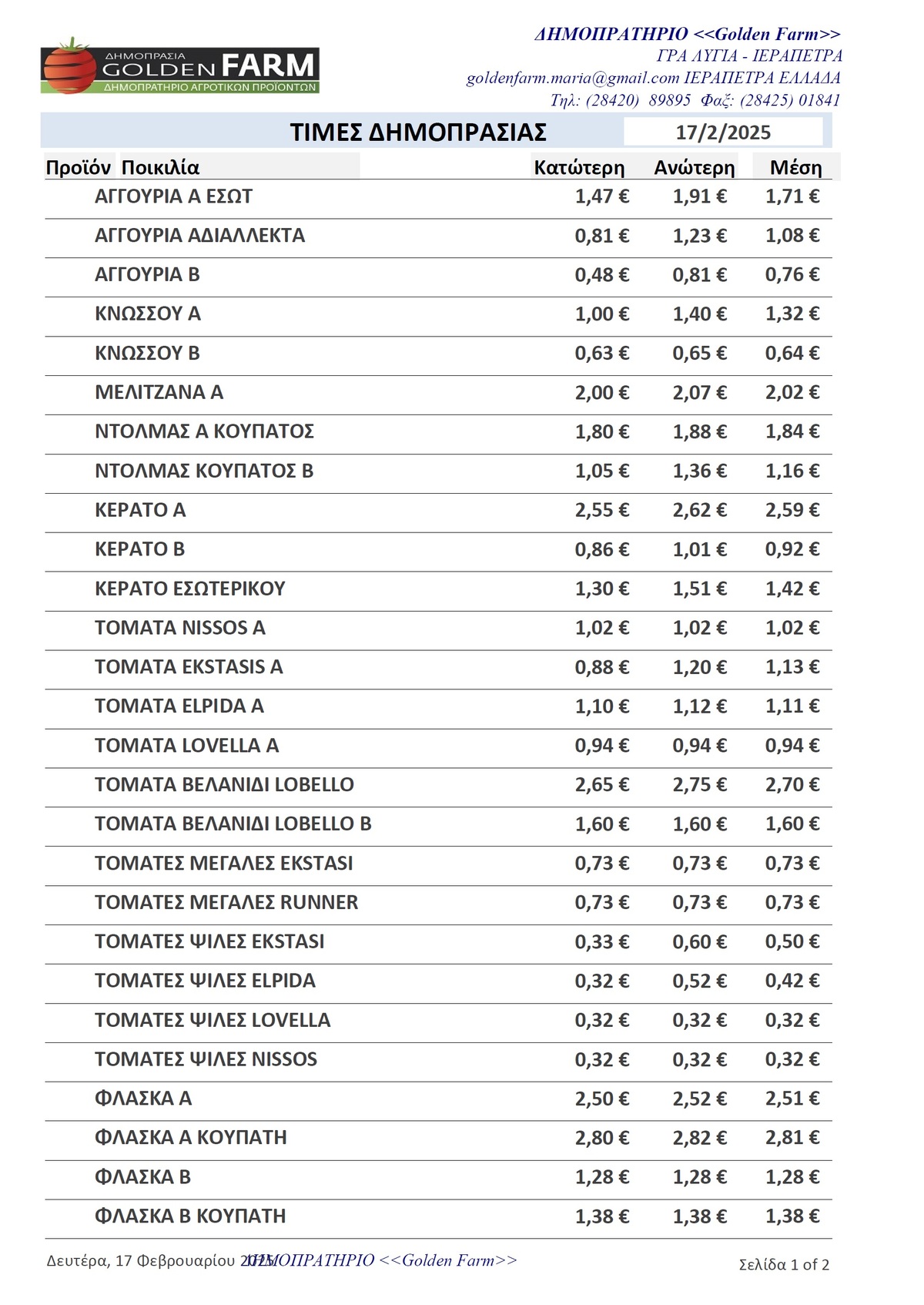 GOLDEN FARM |Τιμές Αγροτικών Προϊόντων 17.02.2025 ΤΙΜΕΣ 4:09 μ.μ. - Δευτέρα 17 Φεβρουαρίου 2025 04:02 μ.μ. - Δευ, 17/09/2025 ΙΕΡΑΠΕΤΡΑ, ΤΙΜΕΣ ΑΓΡΟΤΙΚΩΝ ΠΡΟΙΟΝΤΩΝ , ΔΗΜΟΠΡΑΤΗΡΙΟ, ΚΗΠΕΥΤΙΚΑ , GOLDEN FARM Δείτε τις σημερινές τιμές του δημοπρατηρίου