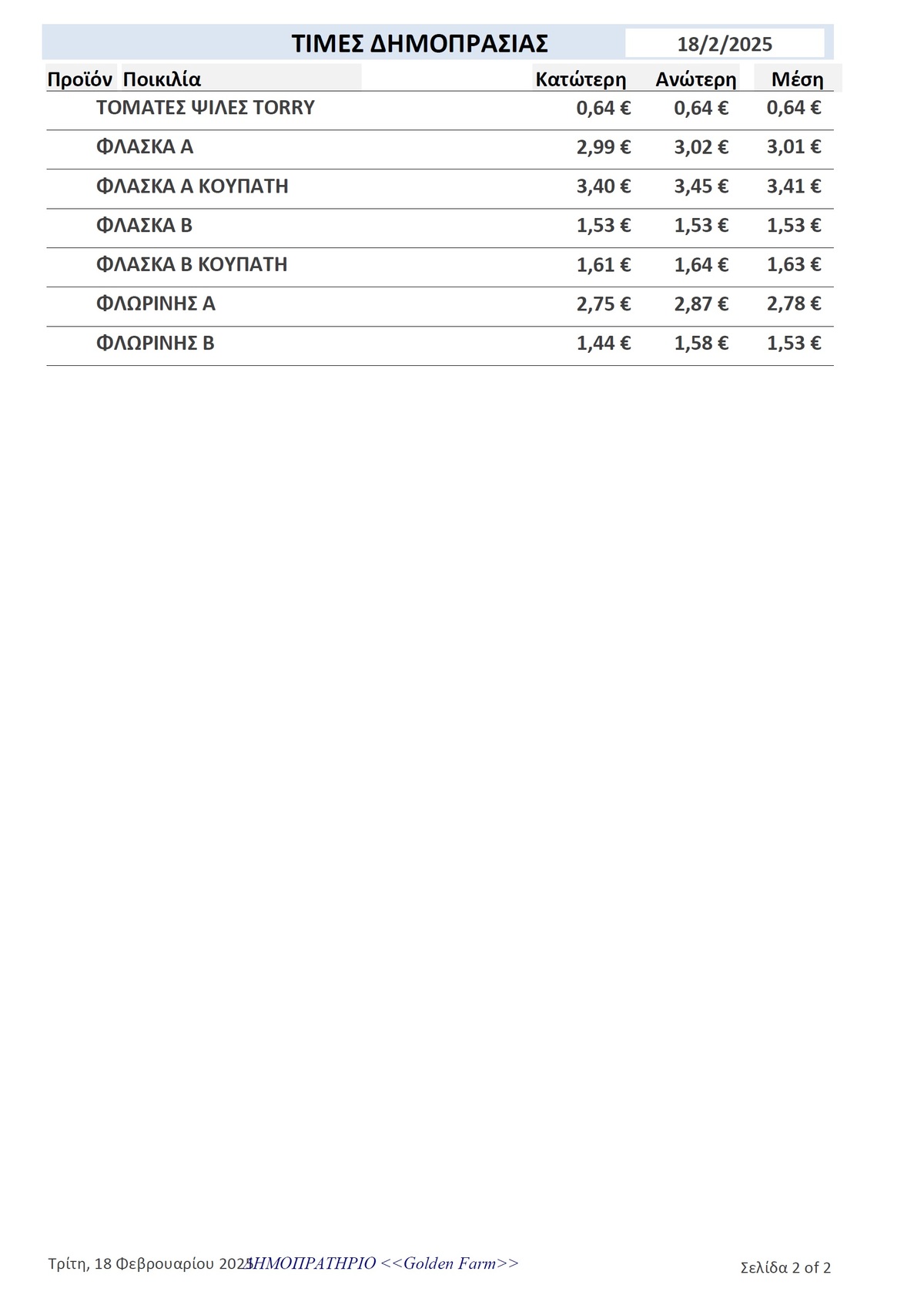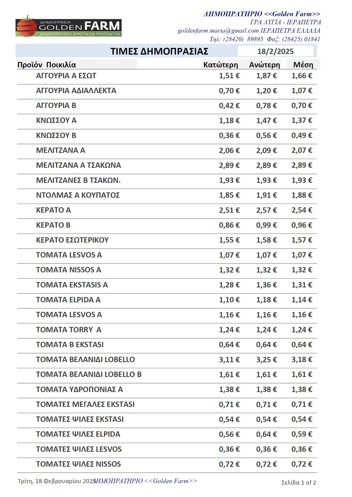 GOLDEN FARM |Τιμές Αγροτικών Προϊόντων 18.02.2025 ΤΙΜΕΣ 4:29 μ.μ. - Τρίτη 18 Φεβρουαρίου 2025 04:02 μ.μ. - Τρί, 18/29/2025 ΙΕΡΑΠΕΤΡΑ, ΤΙΜΕΣ ΑΓΡΟΤΙΚΩΝ ΠΡΟΙΟΝΤΩΝ , ΔΗΜΟΠΡΑΤΗΡΙΟ, ΚΗΠΕΥΤΙΚΑ , GOLDEN FARM Δείτε τις σημερινές τιμές του δημοπρατηρίου