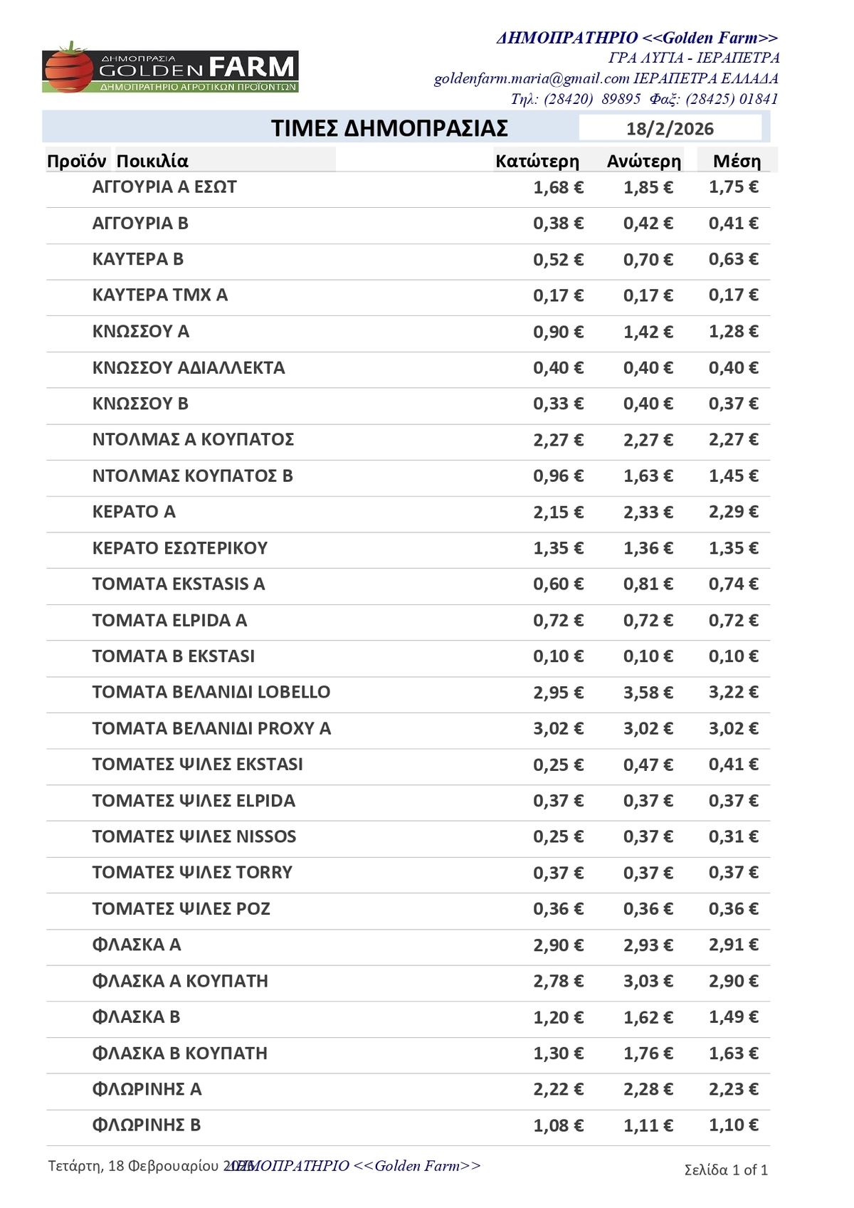 GOLDEN FARM |Τιμές Αγροτικών Προϊόντων 18.02.2026 ΤΙΜΕΣ 2:01 μ.μ. - Τετάρτη 18 Φεβρουαρίου 2026 02:02 μ.μ. - Τετ, 18/01/2026 ΙΕΡΑΠΕΤΡΑ, ΤΙΜΕΣ ΑΓΡΟΤΙΚΩΝ ΠΡΟΙΟΝΤΩΝ , ΔΗΜΟΠΡΑΤΗΡΙΟ, ΚΗΠΕΥΤΙΚΑ , GOLDEN FARM Δείτε τις σημερινές τιμές του δημοπρατηρίου