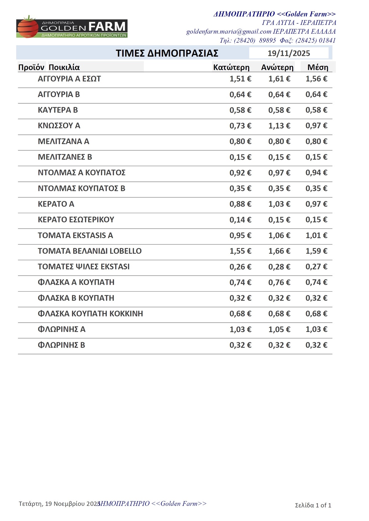 GOLDEN FARM |Τιμές Αγροτικών Προϊόντων 19.11.2025 ΤΙΜΕΣ 2:17 μ.μ. - Τετάρτη, 19 Νοεμβρίου 2025 02:11 μ.μ. - Τετ, 19/17/2025 ΙΕΡΑΠΕΤΡΑ, ΤΙΜΕΣ ΑΓΡΟΤΙΚΩΝ ΠΡΟΙΟΝΤΩΝ, ΔΗΜΟΠΡΑΤΗΡΙΟ, ΚΗΠΕΥΤΙΚΑ , GOLDEN FARM Δείτε τις σημερινές τιμές του δημοπρατηρίου