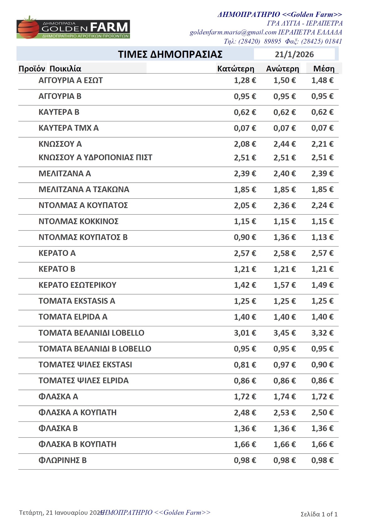 GOLDEN FARM |Τιμές Αγροτικών Προϊόντων 21.01.2026 ΤΙΜΕΣ 1:17 μ.μ. - Τετάρτη 21 Ιανουαρίου 2026 01:01 μ.μ. - Τετ, 21/17/2026 ΙΕΡΑΠΕΤΡΑ, ΤΙΜΕΣ ΑΓΡΟΤΙΚΩΝ ΠΡΟΙΟΝΤΩΝ, ΔΗΜΟΠΡΑΤΗΡΙΟ, ΚΗΠΕΥΤΙΚΑ , ΔΗΜΟΠΡΑΤΗΡΙΑ, GOLDEN FARM Δείτε τις σημερινές τιμές του δημοπρατηρίου