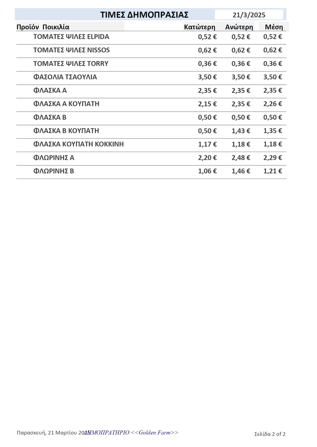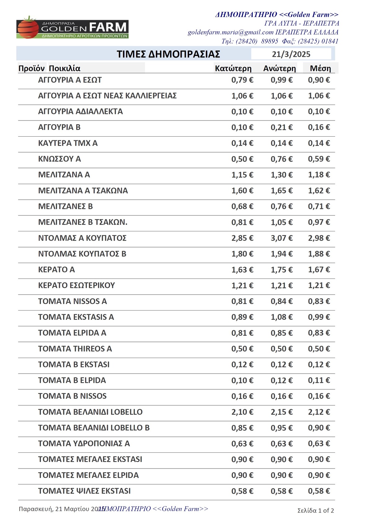 GOLDEN FARM |Τιμές Αγροτικών Προϊόντων 21.03.2025 ΤΙΜΕΣ 6:20 μ.μ. - Παρασκευή 21 Μαρτίου 2025 06:03 μ.μ. - Παρ, 21/20/2025 ΙΕΡΑΠΕΤΡΑ, ΤΙΜΕΣ ΑΓΡΟΤΙΚΩΝ ΠΡΟΙΟΝΤΩΝ , ΔΗΜΟΠΡΑΤΗΡΙΟ, ΚΗΠΕΥΤΙΚΑ , GOLDEN FARM Δείτε τις σημερινές τιμές του δημοπρατηρίου