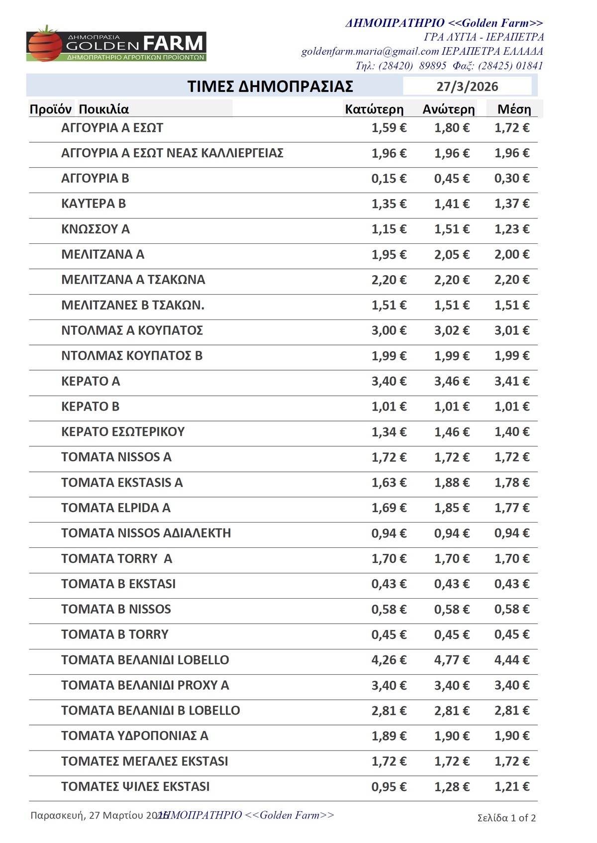 GOLDEN FARM |Τιμές Αγροτικών Προϊόντων 27.03.2026 ΤΙΜΕΣ 3:36 μ.μ. - Παρασκευή 27 Μαρτίου 2026 03:03 μ.μ. - Παρ, 27/36/2026 ΙΕΡΑΠΕΤΡΑ, ΤΙΜΕΣ ΑΓΡΟΤΙΚΩΝ ΠΡΟΙΟΝΤΩΝ , ΔΗΜΟΠΡΑΤΗΡΙΟ, ΚΗΠΕΥΤΙΚΑ , GOLDEN FARM Δείτε τις σημερινές τιμές του δημοπρατηρίου