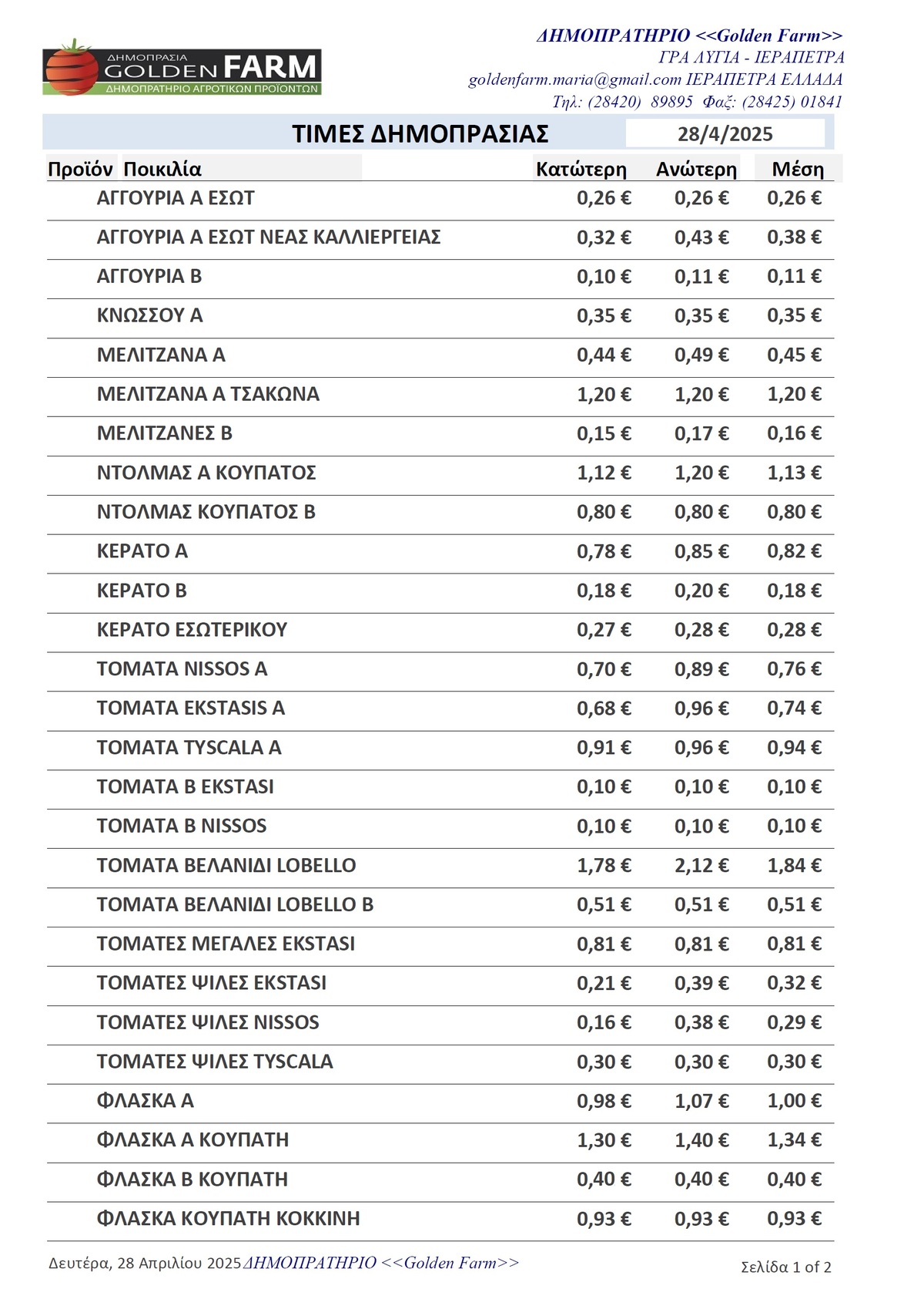 GOLDEN FARM |Τιμές Αγροτικών Προϊόντων 28.04.2025 ΤΙΜΕΣ 4:45 μ.μ. - Δευτέρα 28 Απριλίου 2025 04:04 μ.μ. - Δευ, 28/45/2025 ΙΕΡΑΠΕΤΡΑ, ΤΙΜΕΣ ΑΓΡΟΤΙΚΩΝ ΠΡΟΙΟΝΤΩΝ , ΔΗΜΟΠΡΑΤΗΡΙΟ, ΚΗΠΕΥΤΙΚΑ , GOLDEN FARM Δείτε τις σημερινές τιμές του δημοπρατηρίου