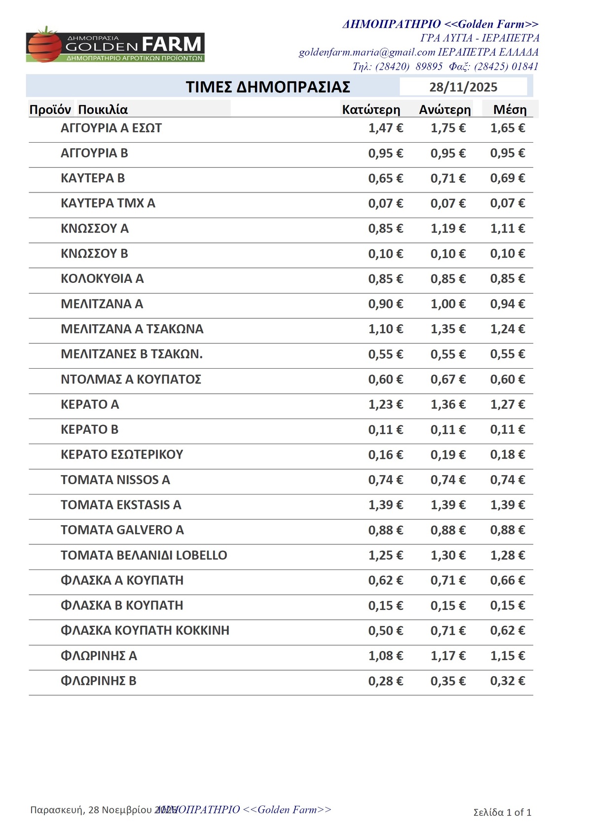 GOLDEN FARM |Τιμές Αγροτικών Προϊόντων 28.11.2025 ΤΙΜΕΣ 3:54 μ.μ. - Παρασκευή, 28 Νοεμβρίου 2025 03:11 μ.μ. - Παρ, 28/54/2025 ΙΕΡΑΠΕΤΡΑ, ΤΙΜΕΣ ΑΓΡΟΤΙΚΩΝ ΠΡΟΙΟΝΤΩΝ , ΔΗΜΟΠΡΑΤΗΡΙΟ, ΚΗΠΕΥΤΙΚΑ , GOLDEN FARM Δείτε τις σημερινές τιμές του δημοπρατηρίου