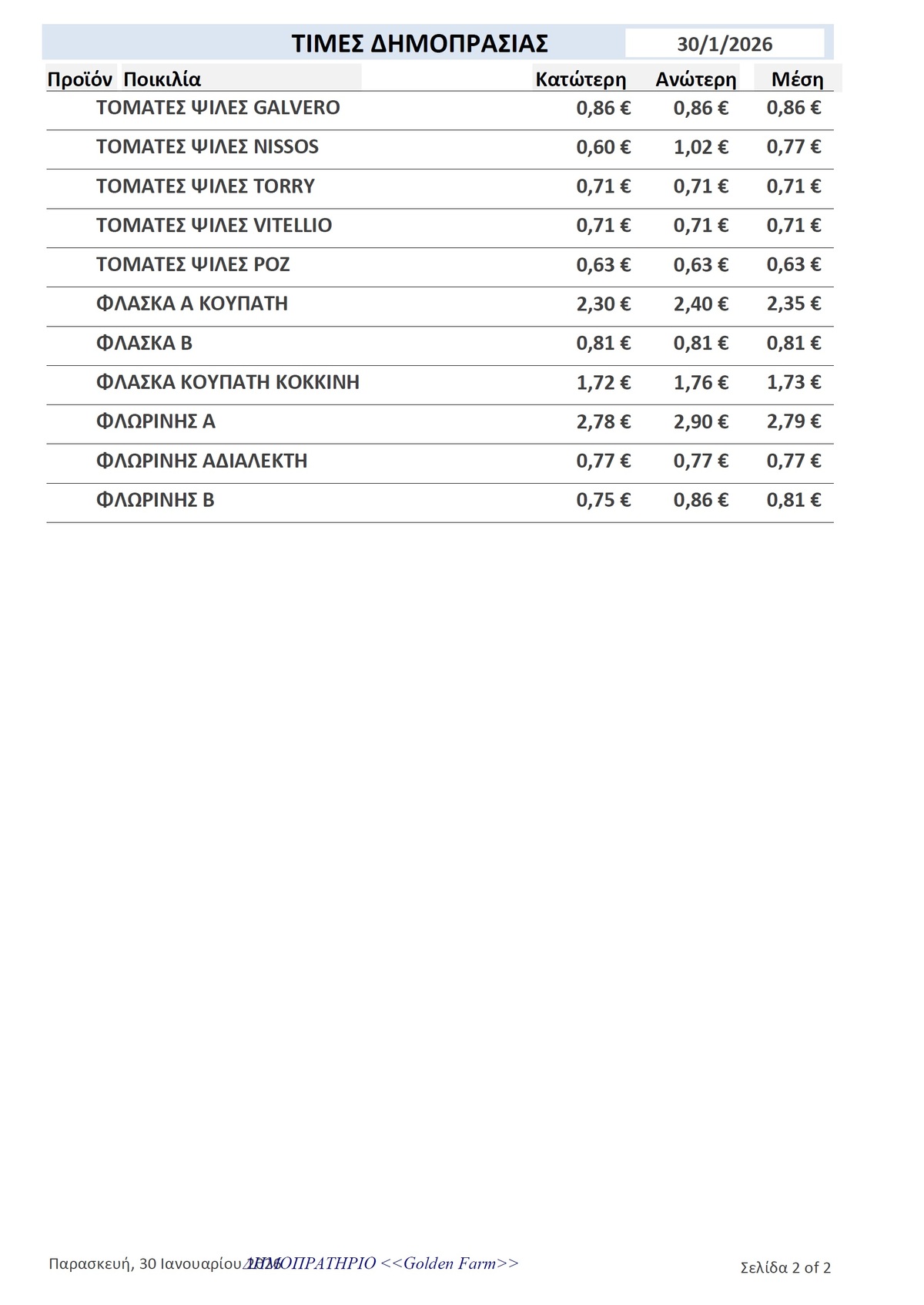 GOLDEN FARM |Τιμές Αγροτικών Προϊόντων 30.01.2026 ΤΙΜΕΣ 2:29 μ.μ. - Παρασκευή 30 Ιανουαρίου 2026 02:01 μ.μ. - Παρ, 30/29/2026 ΙΕΡΑΠΕΤΡΑ, ΤΙΜΕΣ ΑΓΡΟΤΙΚΩΝ ΠΡΟΙΟΝΤΩΝ , ΔΗΜΟΠΡΑΤΗΡΙΟ, ΚΗΠΕΥΤΙΚΑ , GOLDEN FARM Δείτε τις σημερινές τιμές του δημοπρατηρίου