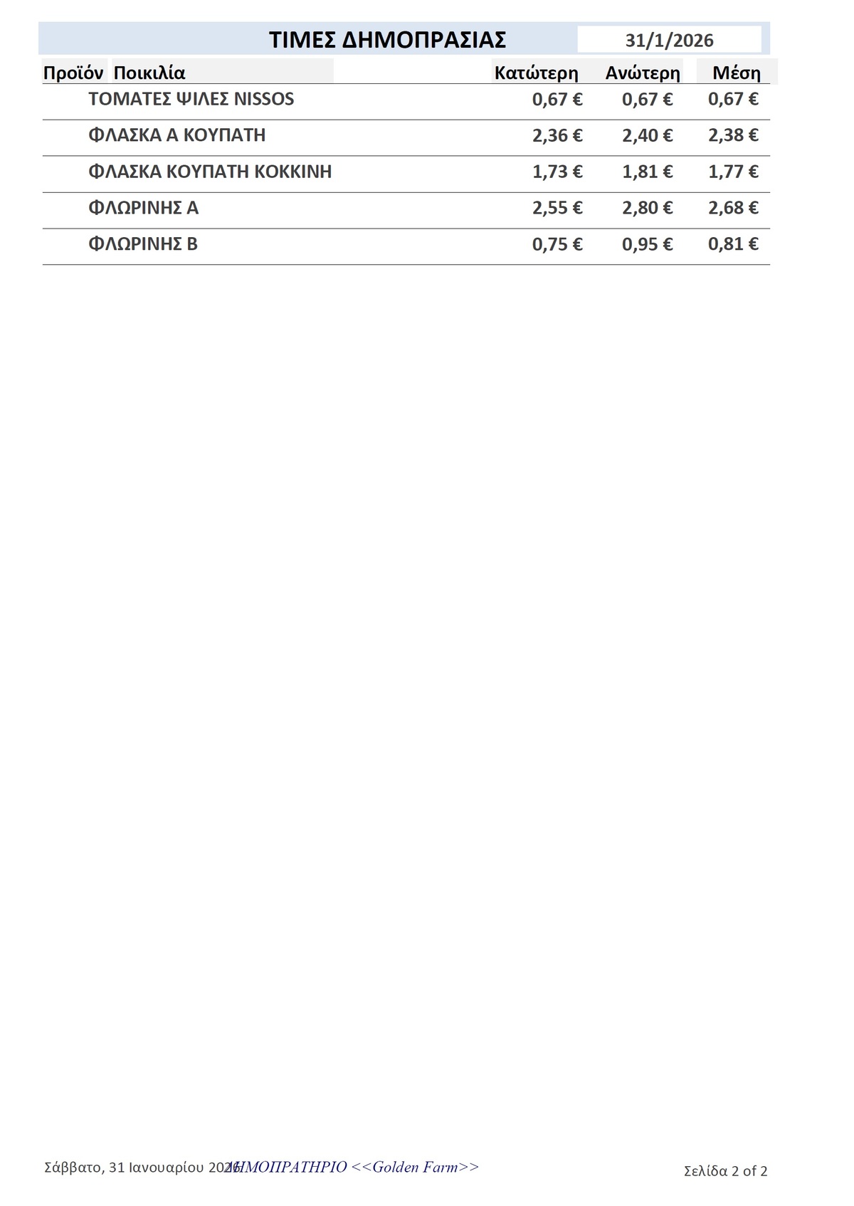 GOLDEN FARM |Τιμές Αγροτικών Προϊόντων 31.01.2026 ΤΙΜΕΣ 3:12 μ.μ. - Σάββατο 31 Ιανουαρίου 2026 03:01 μ.μ. - Σάβ, 31/12/2026 ΙΕΡΑΠΕΤΡΑ, ΤΙΜΕΣ ΑΓΡΟΤΙΚΩΝ ΠΡΟΙΟΝΤΩΝ , ΔΗΜΟΠΡΑΤΗΡΙΟ, ΚΗΠΕΥΤΙΚΑ , GOLDEN FARM Δείτε τις σημερινές τιμές του δημοπρατηρίου