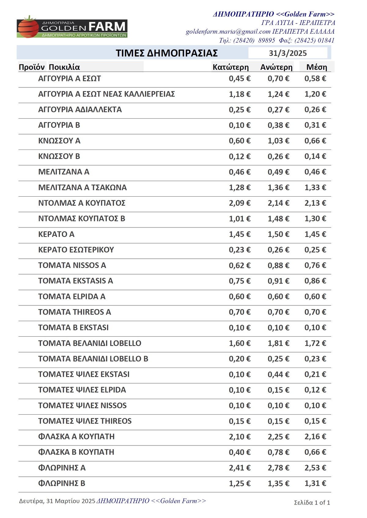 GOLDEN FARM |Τιμές Αγροτικών Προϊόντων 31.03.2025 ΤΙΜΕΣ 3:57 μ.μ. - Δευτέρα, 31 Μαρτίου 2025 03:03 μ.μ. - Δευ, 31/57/2025 ΙΕΡΑΠΕΤΡΑ, ΤΙΜΕΣ ΑΓΡΟΤΙΚΩΝ ΠΡΟΙΟΝΤΩΝ , ΔΗΜΟΠΡΑΤΗΡΙΟ, ΚΗΠΕΥΤΙΚΑ , GOLDEN FARM Δείτε τις σημερινές τιμές του δημοπρατηρίου
