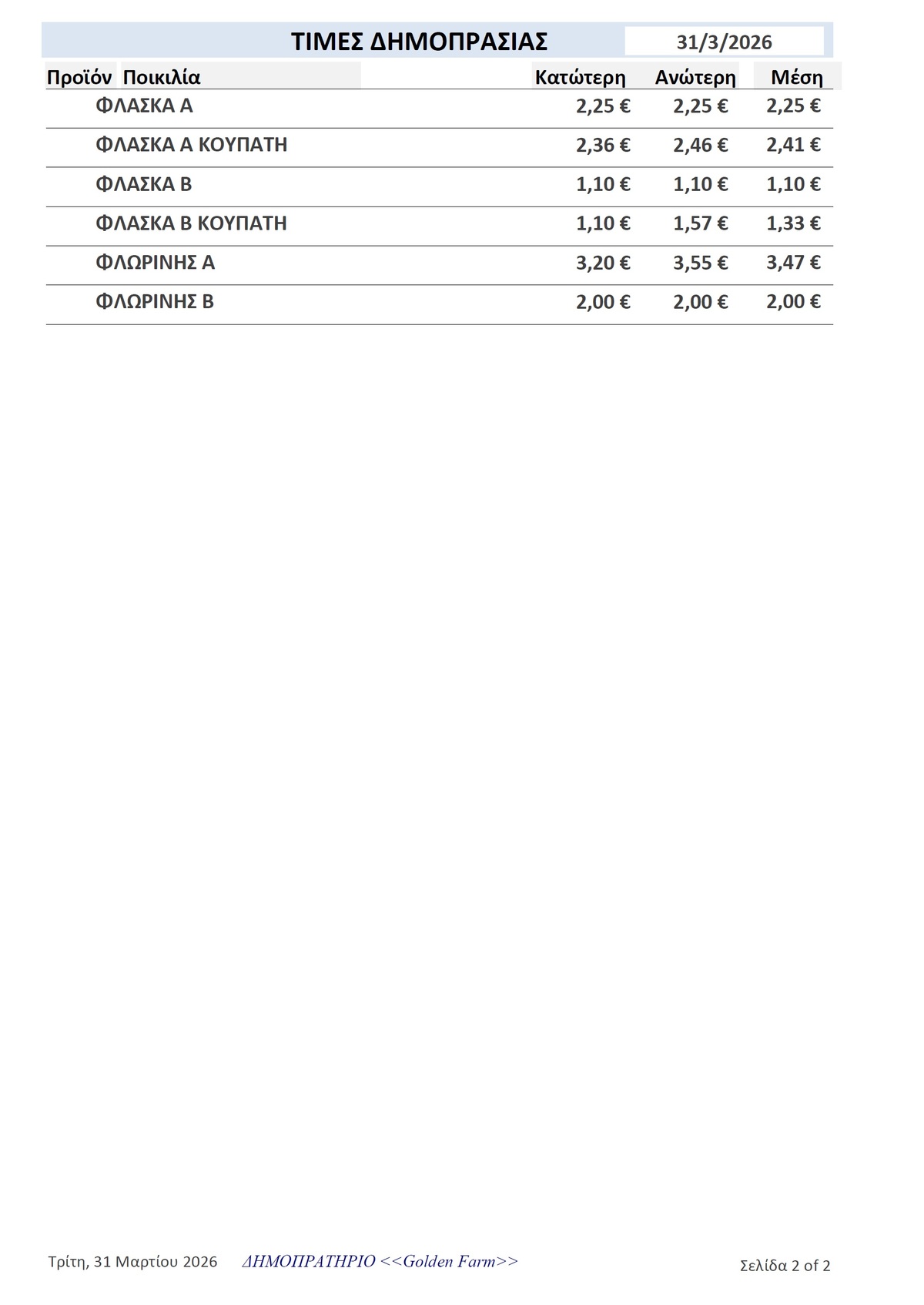 GOLDEN FARM |Τιμές Αγροτικών Προϊόντων 31.03.2026 ΤΙΜΕΣ 3:43 μ.μ. - Τρίτη 31 Μαρτίου 2026 03:03 μ.μ. - Τρί, 31/43/2026 ΙΕΡΑΠΕΤΡΑ, ΤΙΜΕΣ ΑΓΡΟΤΙΚΩΝ ΠΡΟΙΟΝΤΩΝ , ΔΗΜΟΠΡΑΤΗΡΙΟ, ΚΗΠΕΥΤΙΚΑ , GOLDEN FARM Δείτε τις σημερινές τιμές του δημοπρατηρίου