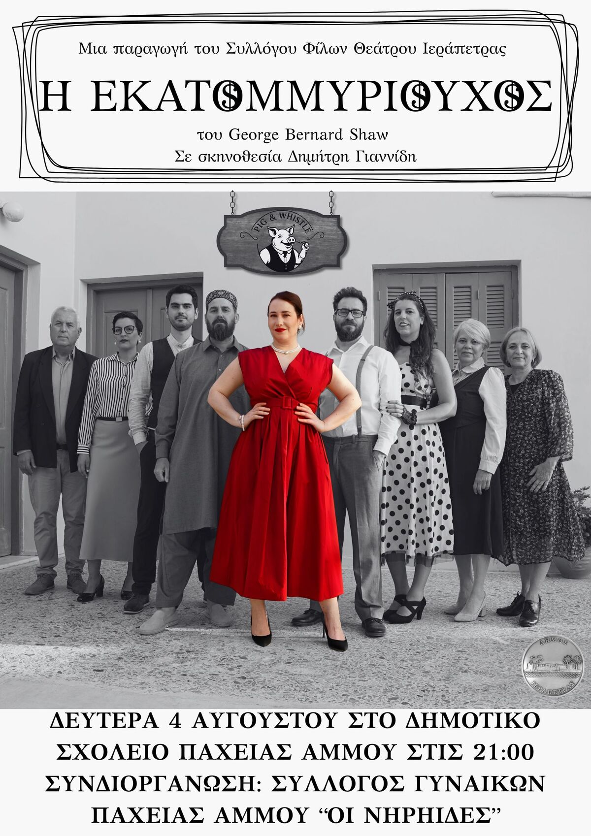 Με ιδιαίτερη χαρά και υπερηφάνεια παρουσιάζουμε στο θεατρόφιλο κοινό της Ιεράπετρας το ευφυές, διαχρονικό και κοινωνικά καυστικό έργο του Τζορτζ Μπέρναρντ Σω, "Η Εκατομμυριούχος".