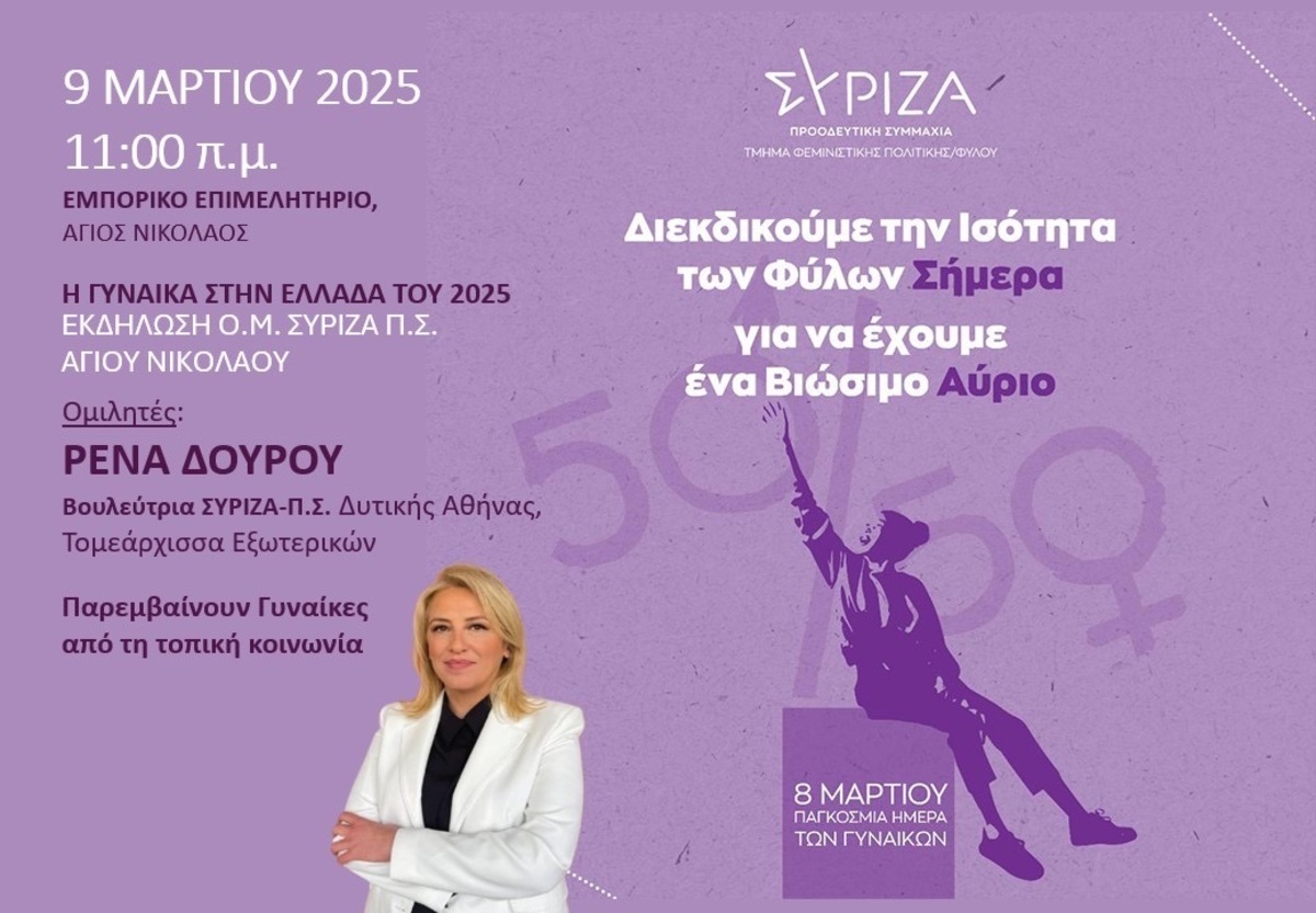 Την Κυριακή 9/3 στις 11:00π.μ. στο Εμπορικό Επιμελητήριο Αγίου Νικολάου, η Οργάνωση Μελών Αγίου Νικολάου του ΣΥΡΙΖΑ-Π.Σ. οργανώνει εκδήλωση με θέμα "Η γυναίκα στην Ελλάδα του 2025" με κεντρική ομιλήτρια την βουλευτή - Τομεάρχη Εξωτερικών του ΣΥΡΙΖΑ-Π.Σ. κ. Ρένα Δούρου, και συμμετοχή της κ. Σοφίας Τσαγκαράκη, Προέδρου του Δικηγορικού Συλλόγου Λασιθίου, της κ. Μαρίας Βάρδα, Περιφερειακής Συμβούλου και της κ. Γιάννας Σιγανού, επιχειρηματία.